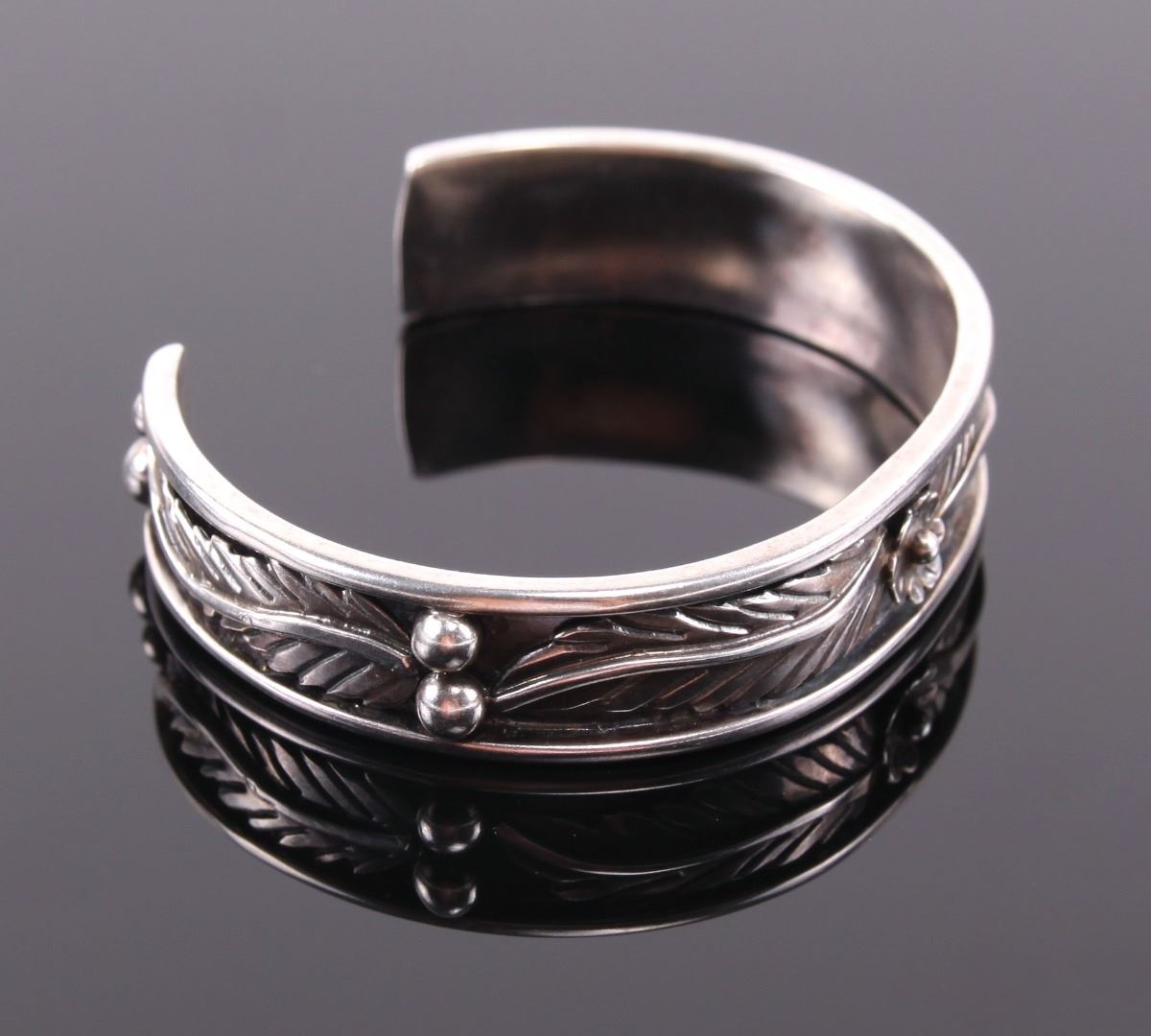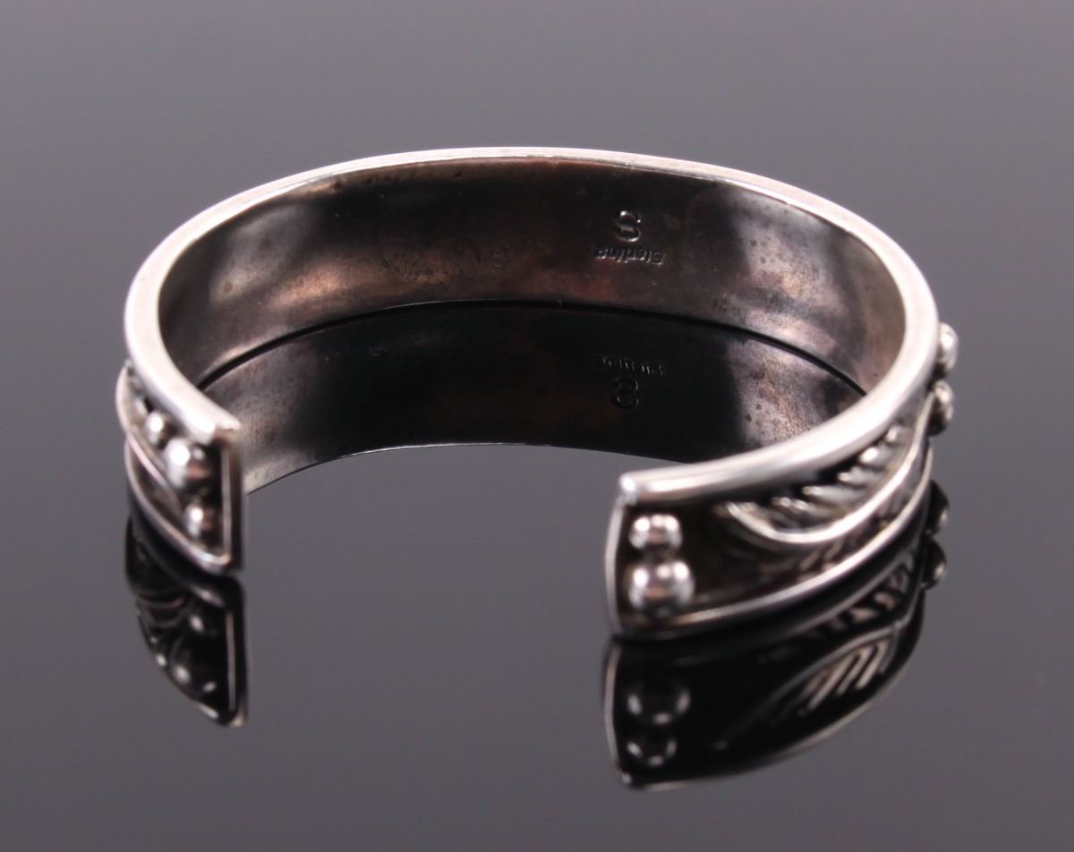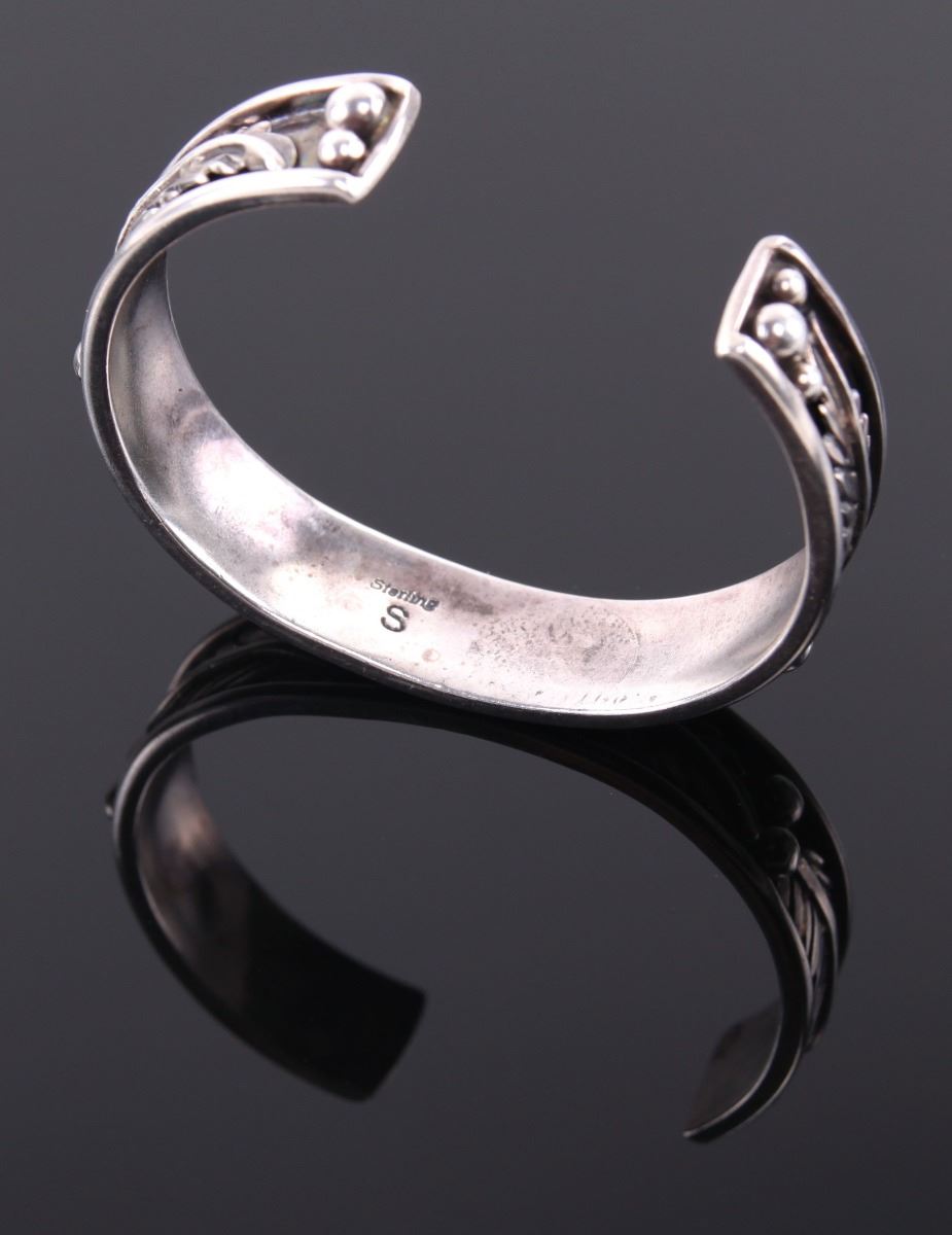 Sarah Chee, Navajo Sterling Silver Cuff Bracelet. Silver Tested. Estimated more than 50 yrs old. The Navajos are a Native American people of the Southwestern United States. After the Cherokee, they are the second largest federally recognized tribe in the United States. Until contact with Pueblos and the Spanish, the Navajos were largely hunters and gatherers. The tribe adopted crop farming techniques from the Pueblo peoples. The practice of spinning and weaving wool into blankets and clothing became common and eventually developed into a form of highly valued artistic expression. Silversmithing is an important art form among Navajos. Atsidi Sani c. 1830–c. 1918 is considered to be the first Navajo silversmith. He learned silversmithing from a Mexican man called Nakai Tsosi "Thin Mexican" around 1878 and began teaching other Navajos how to work with silver. By 1880, Navajo silversmiths were creating handmade jewelry including bracelets, tobacco flasks, necklaces and bracers. Later, they added silver earrings, buckles, bolos, hair ornaments, pins and squash blossom necklaces for tribal use, and to sell to tourists as a way to supplement their income. The Navajos' hallmark jewelry piece called the "squash blossom" necklace first appeared in the 1880s. Turquoise has been part of jewelry for centuries, but Navajo artists did not use inlay techniques to insert turquoise into silver designs until the late 19th century. (Wikipedia) Size: See Ruler Photo. (Photos Represent The Condition Of The Lot.)
