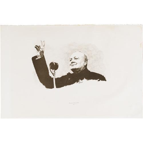 <B>Sarah Churchill Limited Edition Art Print Signed</B></I> <I>"Sarah Churchill"</B></I> in pencil, numbered <I>"263/300"</B></I> in pencil, 35" x 23". In the 1970s, a series of intaglio drawings by Curtis Hooper entitled, "A Visual Philosophy of Sir Winston Churchill" was published by Graphic House. Except for one based on a sketch of her father by Sarah Churchill, each was composed from famous photographs, selected by Sarah to portray the different aspects of her father's life. Each print was assigned a particular Churchill quotation. This print portrays <B>Sir Winston giving the "V" for Victory gesture</B></I> with his quotation: <I>"We shall never forget your endeavors."</B></I> The Churchill coat of arms (Marlborough crest), the London skyline, the quotation, and <I>"Sarah"</B></I> have been debossed beneath the image. There are three small indentations, one beneath the microphone and a light stain at the right edge, and a mounting strip at the upper edge on verso. Very fine.<BR><BR><b>Shipping:</b> Flat Material, Large (<a target="_blank" href="http://www.heritageauctions.com/common/shipping.php">view shipping information</a>)