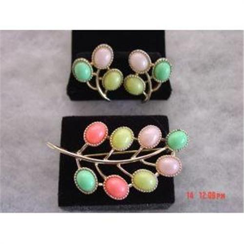 Here is a signed Sarah Coventry Angel pink,gold metal earrings and brooch set. There are pink, light green, and darker green plastic cabachons. Good condition, slight wear to the gold tone metal on the back of the clipped earrings
