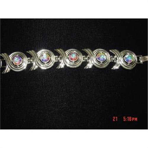 Here is a wonderful signed Sarah Coventry Link Aurora borealis bracelet. I believe I have the matching pieces somewhere else on my site if you would like to have a set. This is in excellent condition and has sprarkling aurora borealis stones on each of the 5 links.