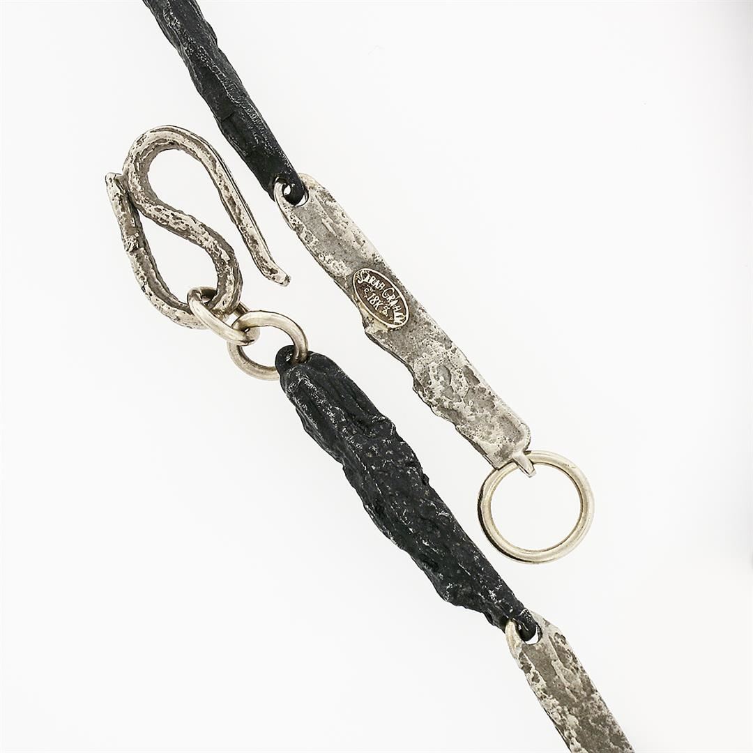 A Sarah Graham chrome & 18k white gold necklace, with 1 oval drop shape natural tahitian pearl (12.67x9.10mm), and 4 round brilliant cut natural diamonds (F - VS1; 0.08ctw ), and 3 round brilliant cut natural black diamonds (0.06ctw ). 17 inch cobalt chrome and "manzanita bark" link chain, 41.41 grams total weight, pendant width measures 15.55mm.