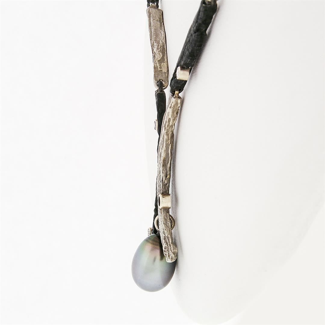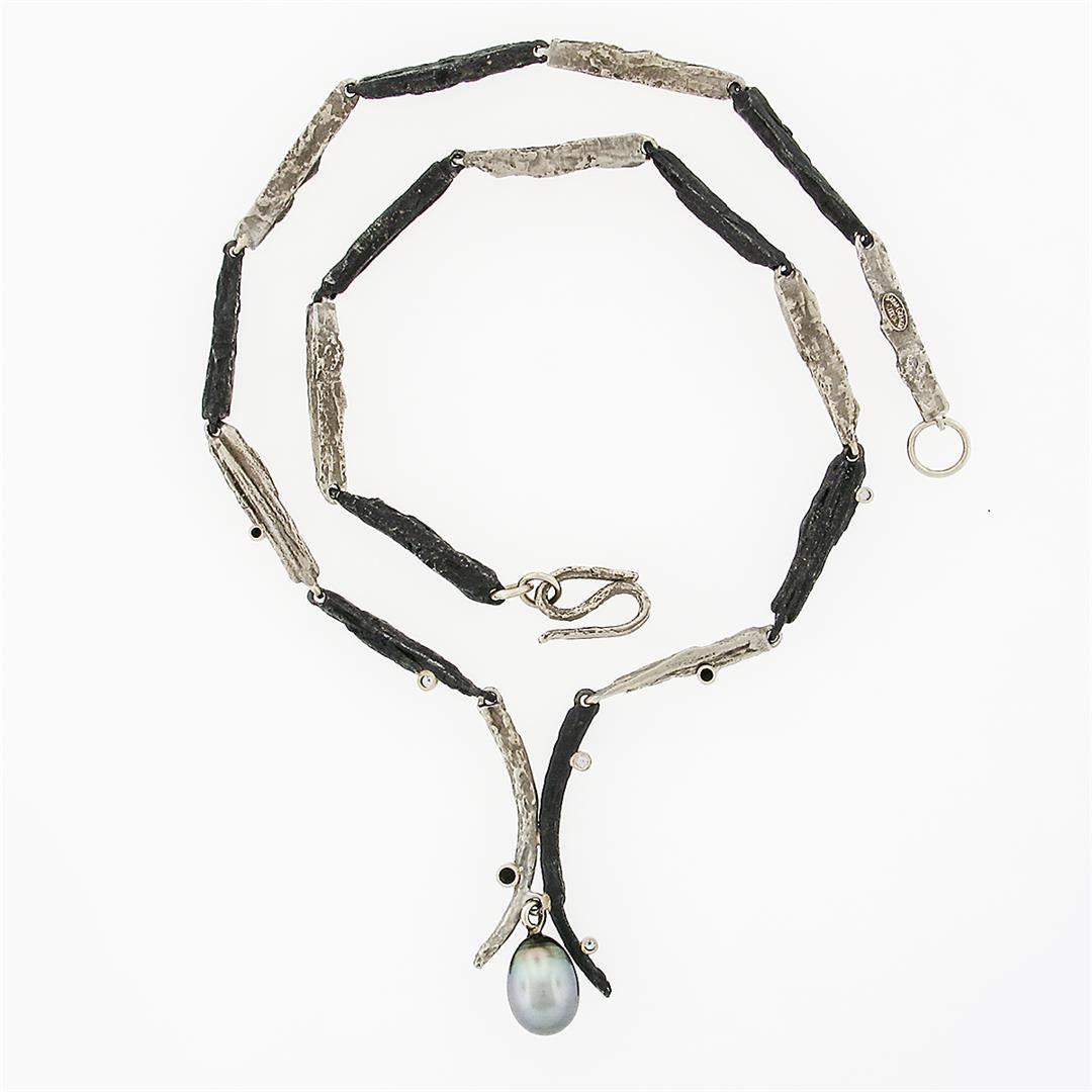 A Sarah Graham chrome & 18k white gold necklace, with 1 oval drop shape natural tahitian pearl (12.67x9.10mm), and 4 round brilliant cut natural diamonds (F - VS1; 0.08ctw ), and 3 round brilliant cut natural black diamonds (0.06ctw ). 17 inch cobalt chrome and "manzanita bark" link chain, 41.41 grams total weight, pendant width measures 15.55mm.