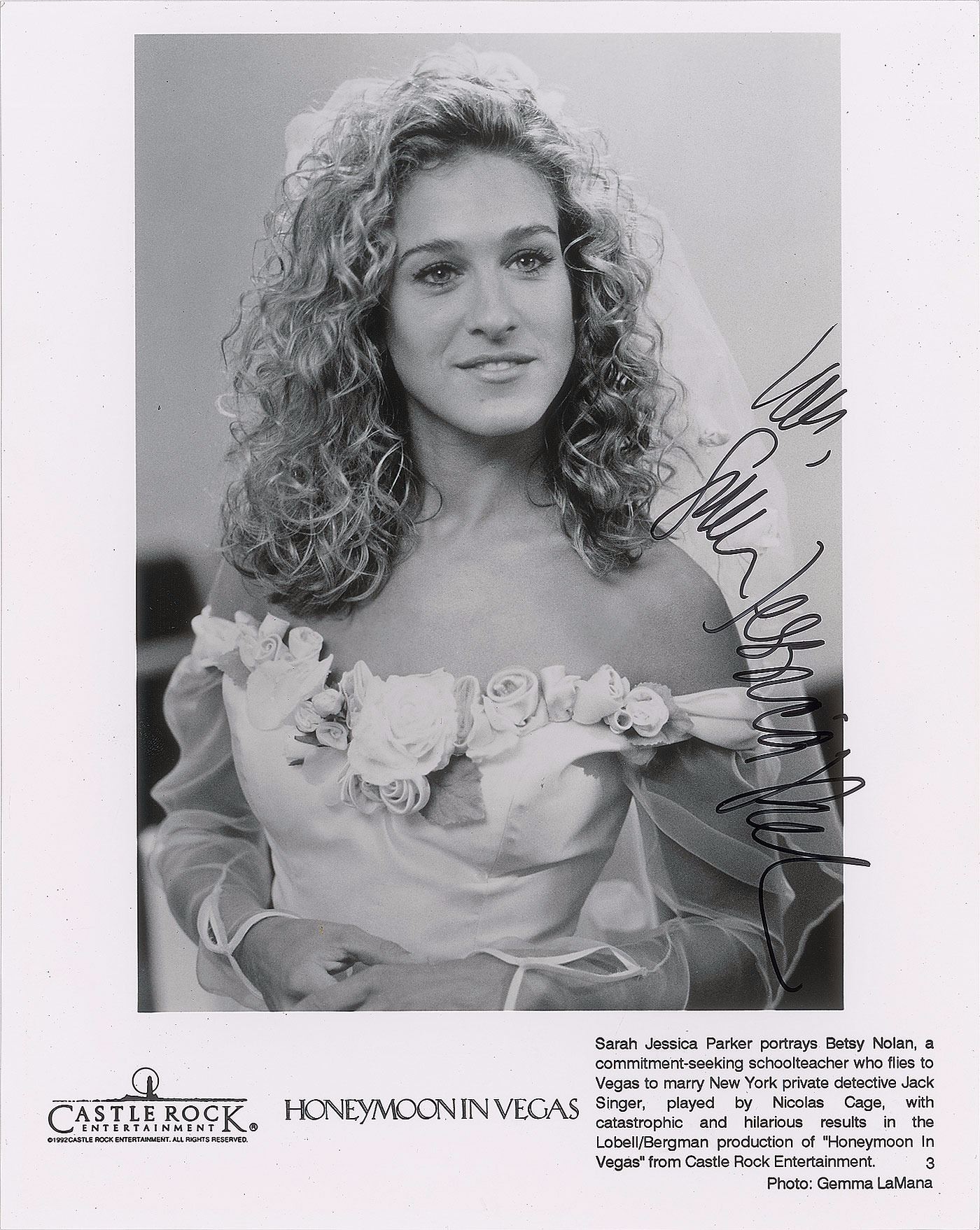 Glossy 8 x 10 Castle Rock publicity photo of Parker as Betsy Nolan from the 1992 film Honeymoon in Vegas, signed in black felt tip, "Love, Sarah Jessica Parker." In fine condition. From the Harvey and Rhoda Kuflik Collection.