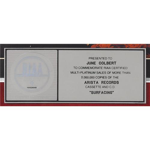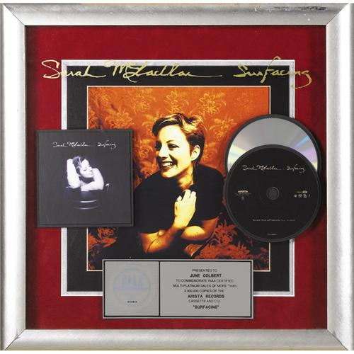 <B>Sarah McLachlan "Surfacing" Double-Platinum Album Award.</B></I> Presented to June Colbert to commemorate the sale of two million copies of the 1997 Grammy Award-winning album. In Excellent condition, framed to an overall size of 18" x 18".