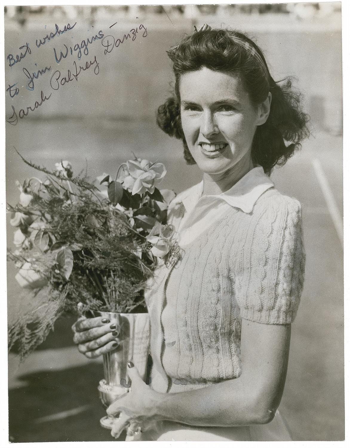 International Tennis Hall of Famer (1912-1996) and two-time US Open champion. Vintage glossy 6.5 x 8.5 Wide World press photo, signed and inscribed later in black felt tip “Best wishes to Jim Wiggins — Sarah Palfrey Danzig,” with Danzig tracing over her unsuccessful ballpoint inscription. In very good condition, with trimmed edges, scattered light rippling and creasing, and scattered crazing to surface, lightly affecting signature and inscription.