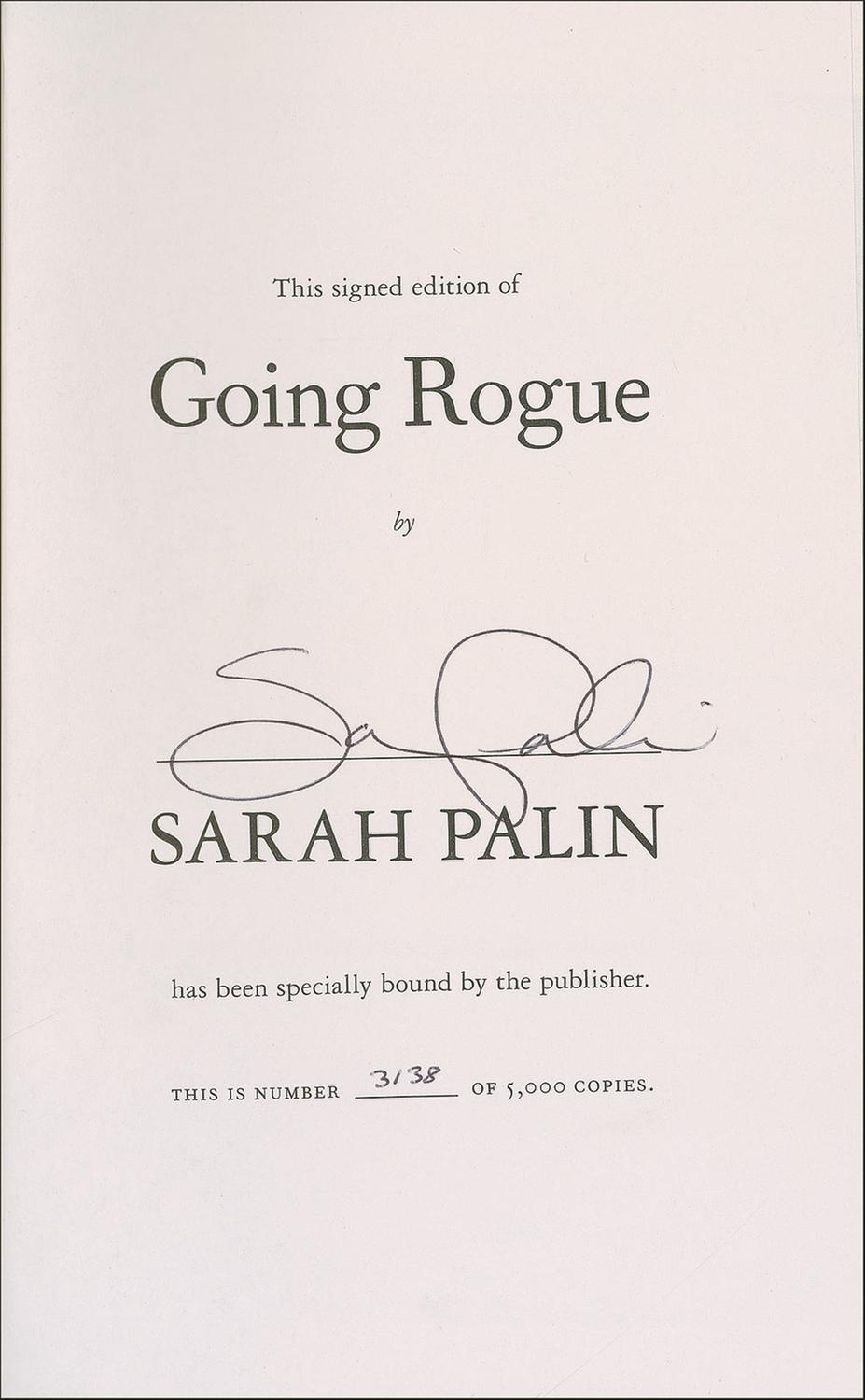 Signed book: Going Rogue: An American Life. Special autographed limited edition of 5000 copies of first edition, first printing (this being no. 3138). NY: Harper Collins, 2009. Hardcover with dustjacket, 6.25 x 9.25, 413 pages. Signed on a special prefatory page in black ink. Book is housed in its original leather presentation box. In very fine condition.