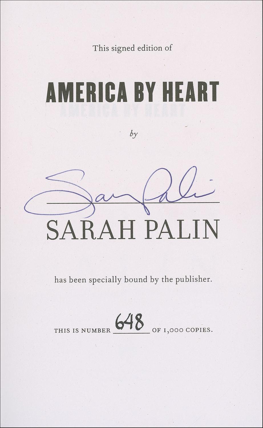 Signed book: America by Heart. Limited edition first edition, first printing of 1000 copies (this being no. 648). NY: Harper Collins, 2010. Hardcover, 5.75 x 8.5, 272 pages. Signed on the limitations page in blue ink. In very fine condition. An accompanying descriptive card notes that the book features “colored endpapers, gilt edges, a ribbon marker, and thirty-five color photographs.”
