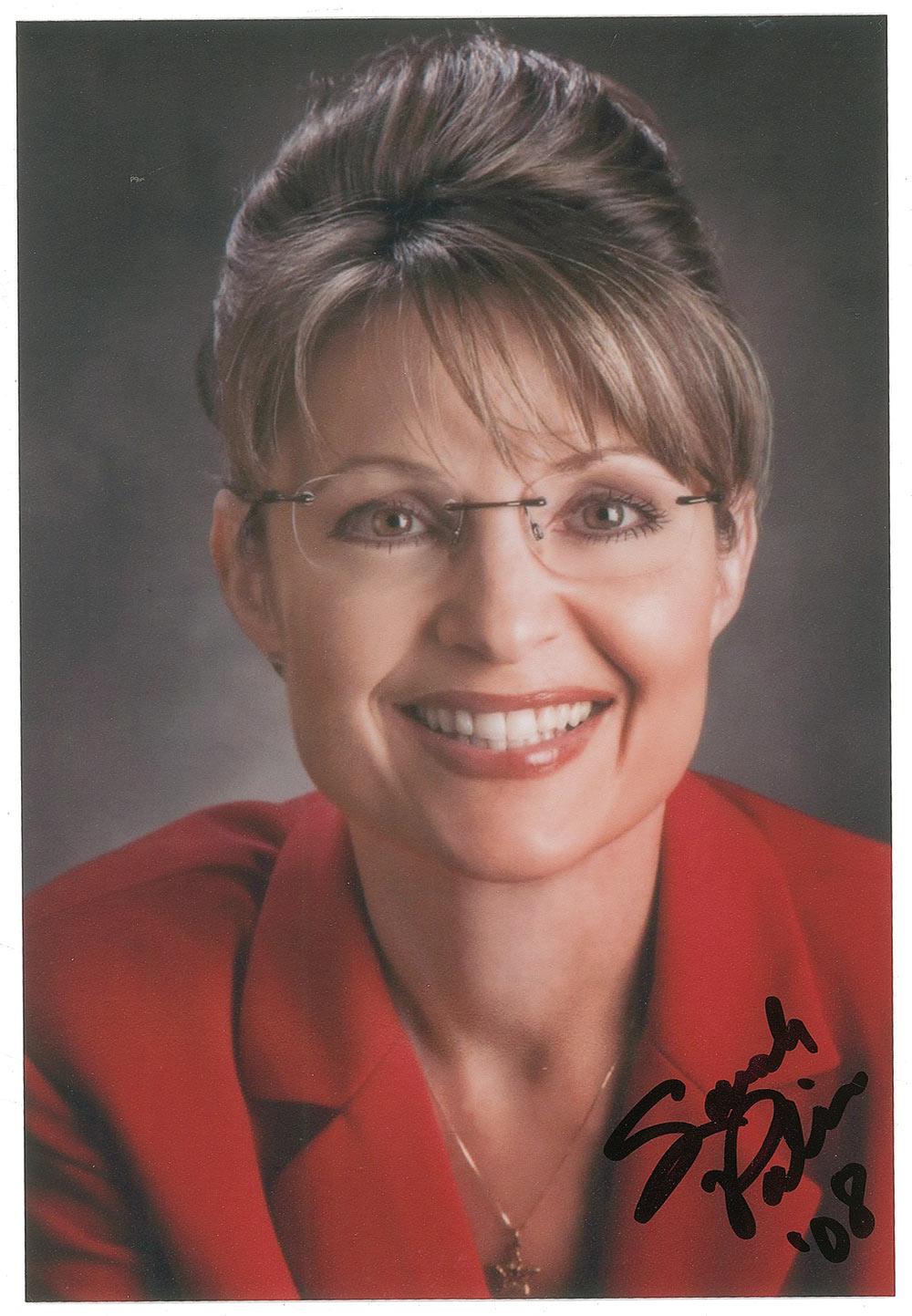 Color satin-finish 4 x 6 photo of the smiling Republican, signed in black felt tip “Sarah Palin ‘08.” In fine condition, with a faint bend.