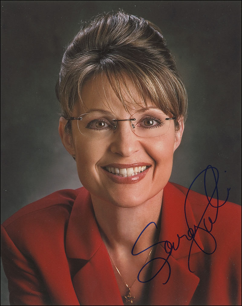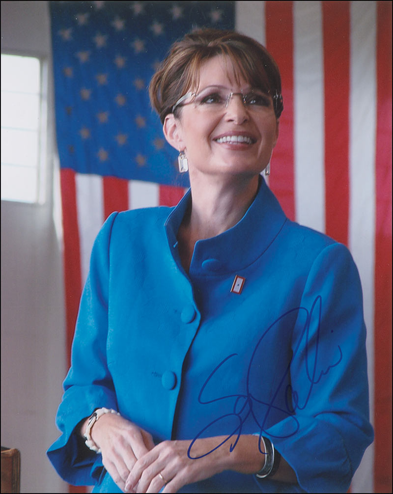 Two color satin-finish 8 x 10 photos of Palin, each signed in blue felt tip. In overall fine condition with a few surface impressions.