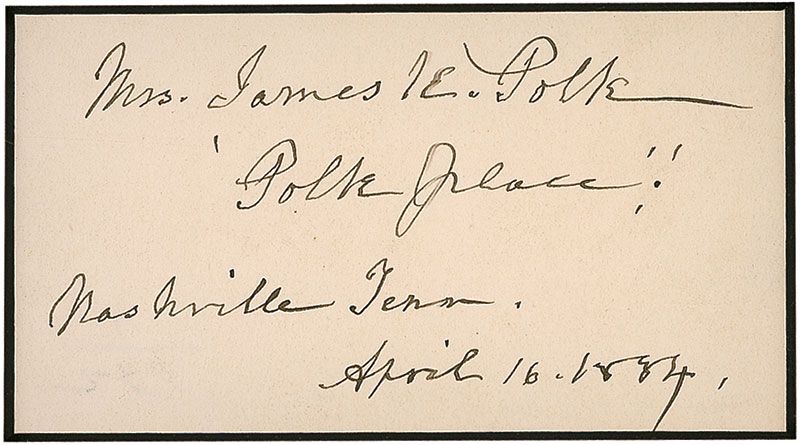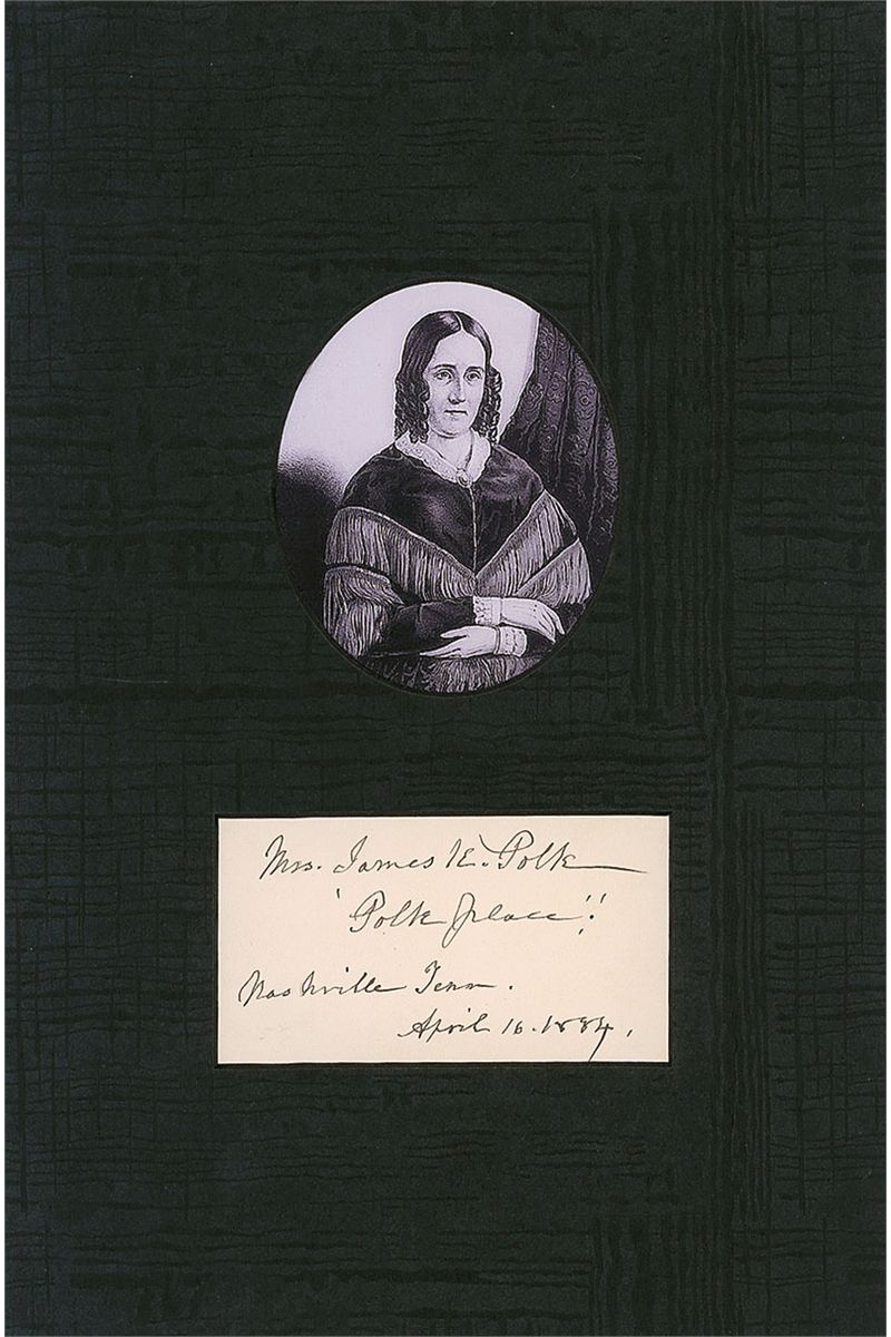 Ink signature, “Mrs. James K. Polk, ‘Polk Place,’ Nashville, Tenn., April 16, 1884,” on an off-white 4 x 2.25 album page. Matted with an image to an overall size of 8 x 12. In fine, bright condition.