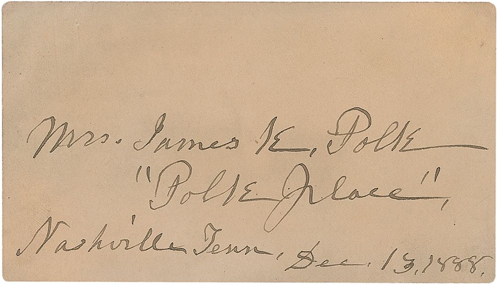 Ink signature, “Mrs. James K. Polk, ‘Polk Place’ Nashville, Tenn, Dec 13, 1888,” on an off-white 4.75 x 2.5 card. Uniform toning, paperclip impression to top edge, and a bit of scattered light soiling, otherwise fine condition.
