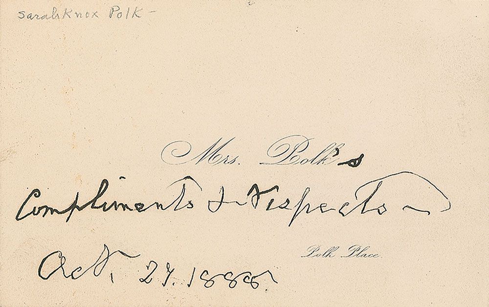 Wife of President James K. Polk (1803–1891) and first lady from 1845 to 1849. Ink signature, “Mrs. James K. Polk, ‘Polk Place,’ Sept. 16, 1885,” on an off-white 4 x 2.5 card. In fine condition, with light scattered soiling. Accompanied by one of her personal calling cards, 4.25 x 2.75, on which she has written, “Compliments & respects, Oct. 29, 1888.”