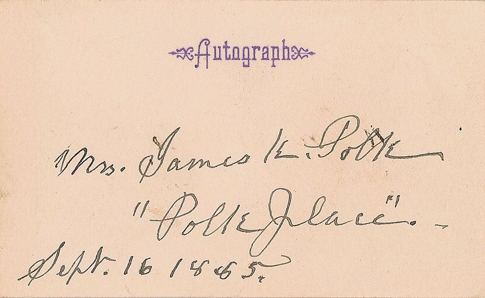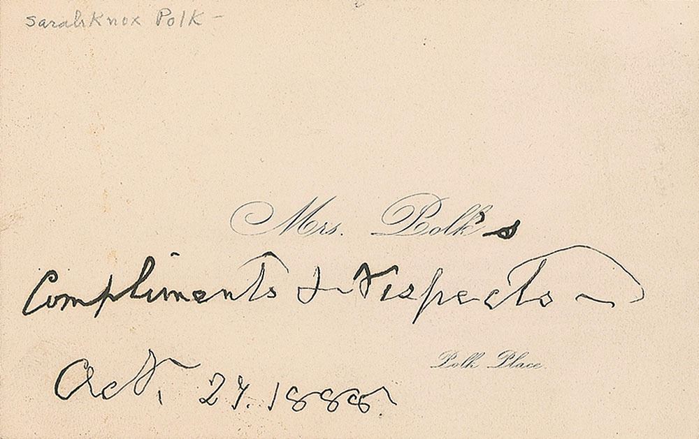 Wife of President James K. Polk (1803–1891) and first lady from 1845 to 1849. Ink signature, “Mrs. James K. Polk, ‘Polk Place,’ Sept. 16, 1885,” on an off-white 4 x 2.5 card. In fine condition, with light scattered soiling. Accompanied by one of her personal calling cards, 4.25 x 2.75, on which she has written, “Compliments & respects, Oct. 29, 1888.”