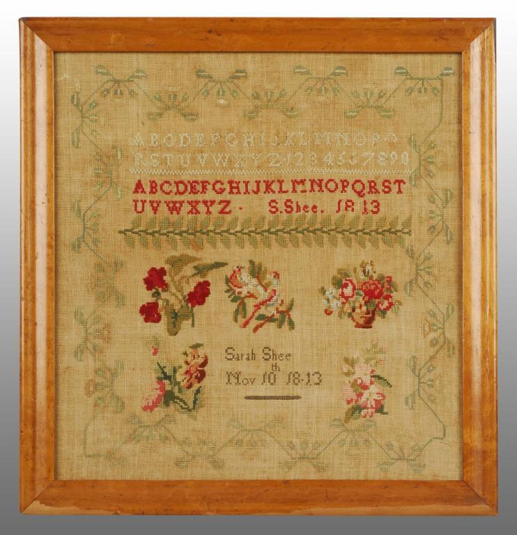 Description American. November 10, 1813. Silk and wool on brown linen. Some loss of wool. Some discoloration. Condition (Good). Size 19" x 18".