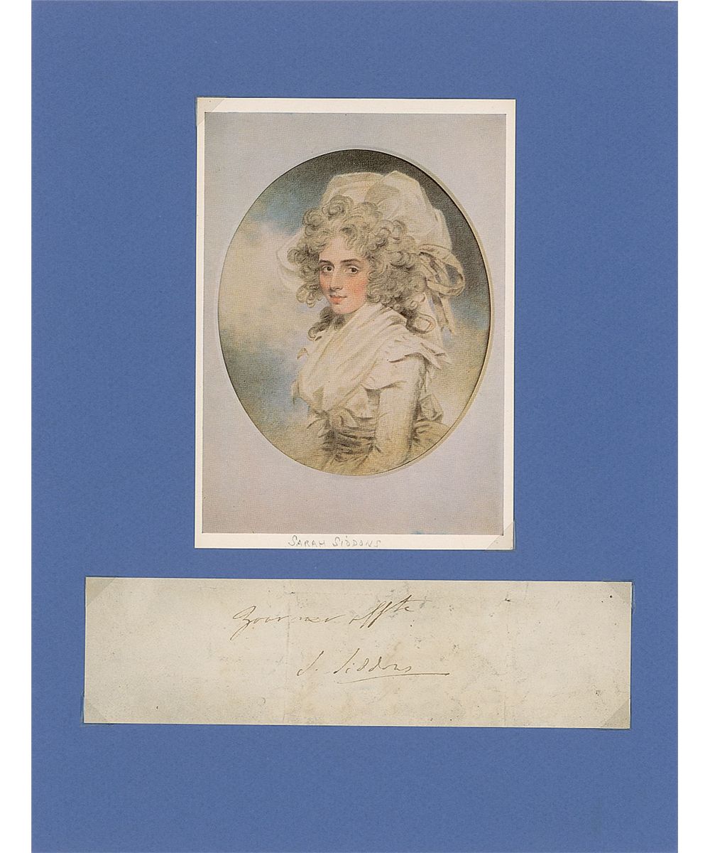 British actress (1755–1831) who became the queen of the stage, unrivaled as a tragic actress. Ink signature, “Yours & affect, S. Siddons,” on an off-white 7 x 2 slip clipped from the closing of a letter. In very good condition, with two vertical folds, some light creasing and soiling, signature a bit light, but still legible, and show-through from writing on reverse.