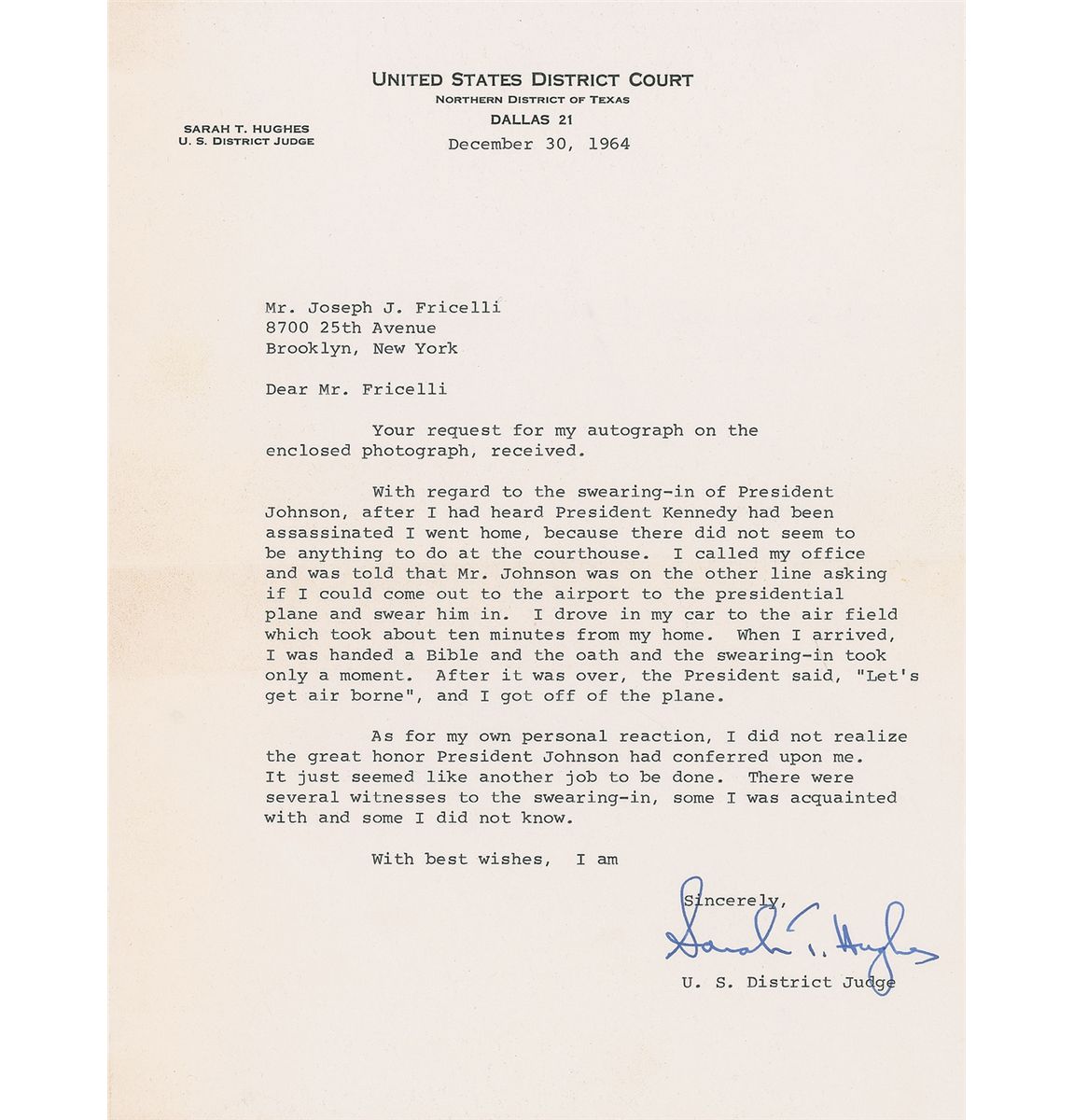 TLS signed “Sarah T. Hughes,” one page, 8 x 10.5, United States District Court letterhead, December 30, 1964. Letter to Joseph Fricelli. In part: “With regard to the swearing-in of President Johnson, after I had heard that Kennedy had been assassinated I went home, because there did not seem to be anything to do at the courthouse. I was called by my office and was told that Mr. Johnson was on the other line asking if I could come out to the airport to the presidential plane and swear him in. I drove my car to the air field which took about ten minutes from my home. When I arrived, I was handed a Bible and the oath and the swearing-in took place. After it was over, the President said, ‘Let’s get air borne,’ and I got off the plane.” In fine condition. Accompanied by the original mailing envelope. An uncommon perspective from the first woman to swear in a president.