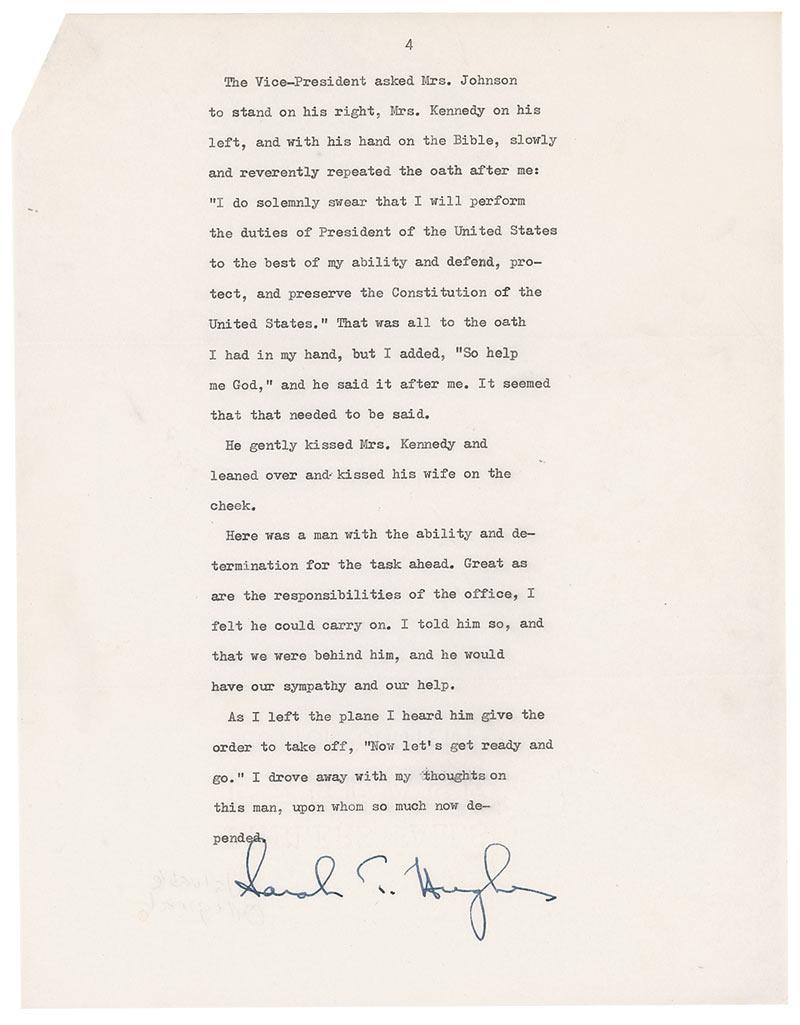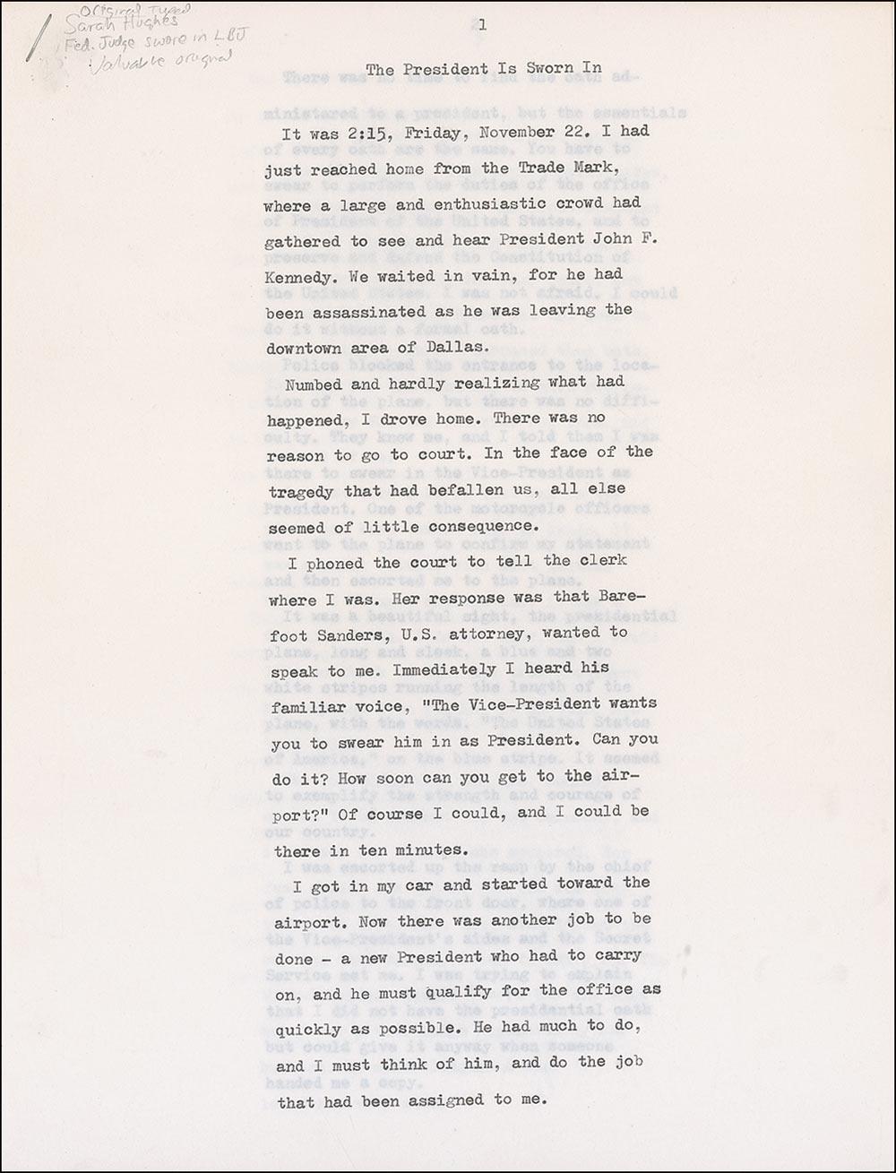 Federal judge (1896–1985) who swore in Lyndon B. Johnson as President of the United States on Air Force One after JFK’s assassination. Souvenir typescript, four page, 8.5 x 11, detailing the justice’s role in the swearing-in of Lyndon B. Johnson, signed at the bottom of the last page in fountain pen, “Sarah T. Hughes.” In part: “I was escorted up the ramp by the chief of police to the front door, where one of the Vice-President’s aides and the Secret Service met me. I was trying to explain that I did not have the presidential oath but could give it anyway when someone handed me a copy…The Vice-President and Mrs. Kennedy wanted to be present for the ceremony, and in a very few minutes she appeared. Her face showed her grief, but she was composed and calm. She, too, exemplified the courage this country needs to carry on. The Vice-President leaned toward her and told her I was a U.S. judge appointed by her husband. My acknowledgement was, ‘I loved him very much.’” In fine condition, with light handling wear and stapled at the top left corner.