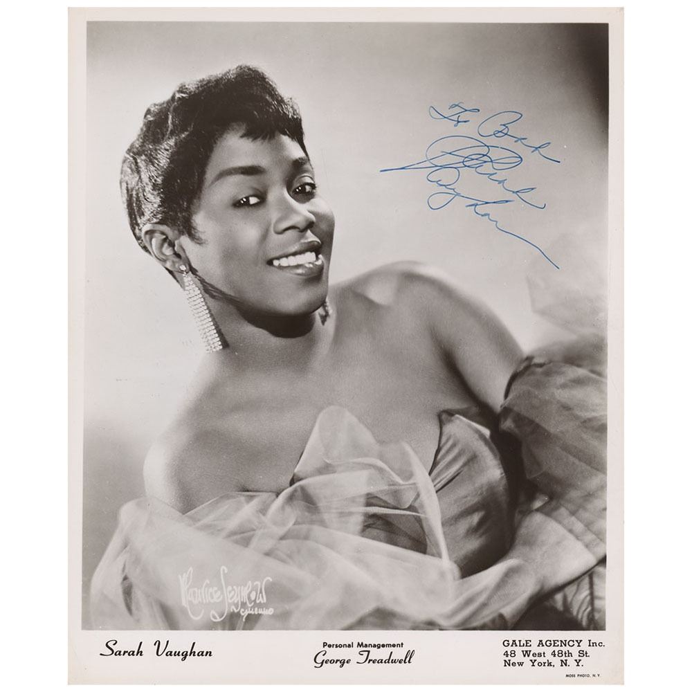 Vintage glossy 8.25 x 10 promotional photo of Vaughan wearing an off-the-shoulder dress by the Maurice Seymour Studio, signed and inscribed in fountain pen, "To Bob, Sarah Vaughan.†In fine condition. Accompanied by a certificate of authenticity from JSA.