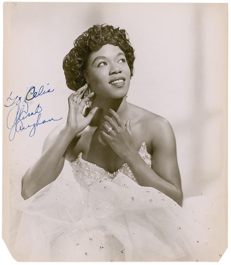 Vintage glossy 8 x 9 photo or Vaughan elegantly attired, signed and inscribed in fountain pen “To Celia, Sarah Vaughan.” A notation on the reverse notes that the signature was obtained outside a New York City theater in January 1953. In very good condition, with a few creases, clipped bottom corners, a tiny piece of old, clear tape over the first letter of the inscription, slight discoloration along the borders, and trimmed borders.
