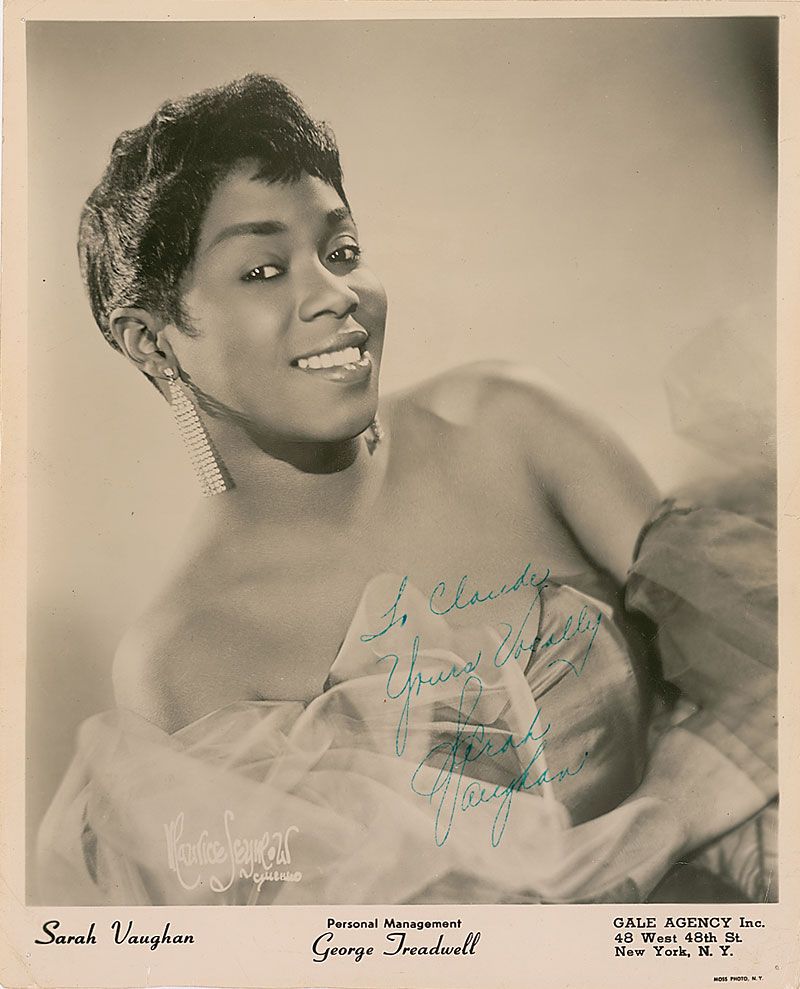 Attractive vintage glossy 8 x 10 publicity photo, signed and inscribed in blue ink “To Claude, Yours vocally, Sarah Vaughan.” In very good condition, with scattered creases, a single tack hole to each corner, and slight irregular adhesion to the inscription and signature.