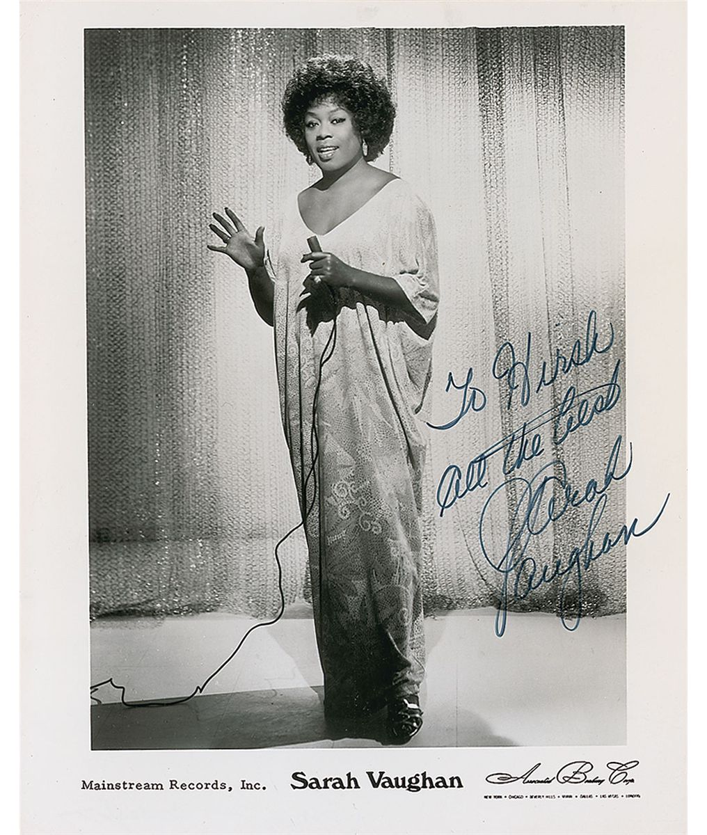 Glossy 8 x 10 Mainstream Records publicity photo, signed and inscribed in black felt tip “To Hirsh, all the best, Sarah Vaughan.” In fine condition, with two paperclip impressions to the right border and mild corner tip bends.