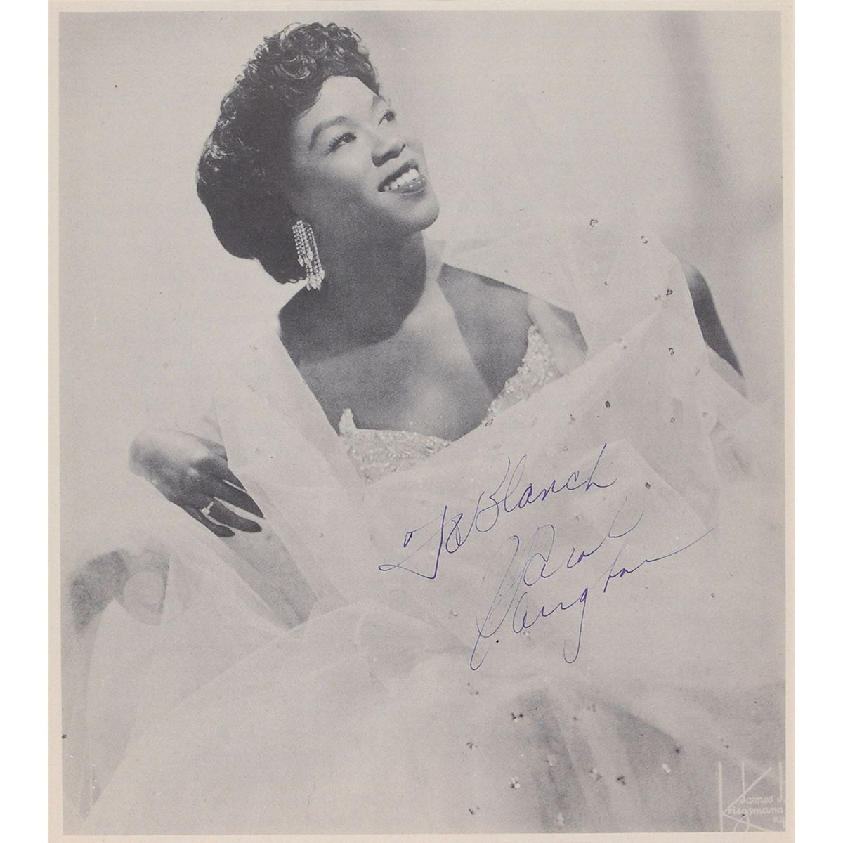 Vintage 8 x 9 paperstock photo of Vaughan in a stunning dress, signed and inscribed in purple fountain pen, “To Blanch, Sarah Vaughan.” Matted to an overall size of 11.75 x 12.75. In fine condition.
