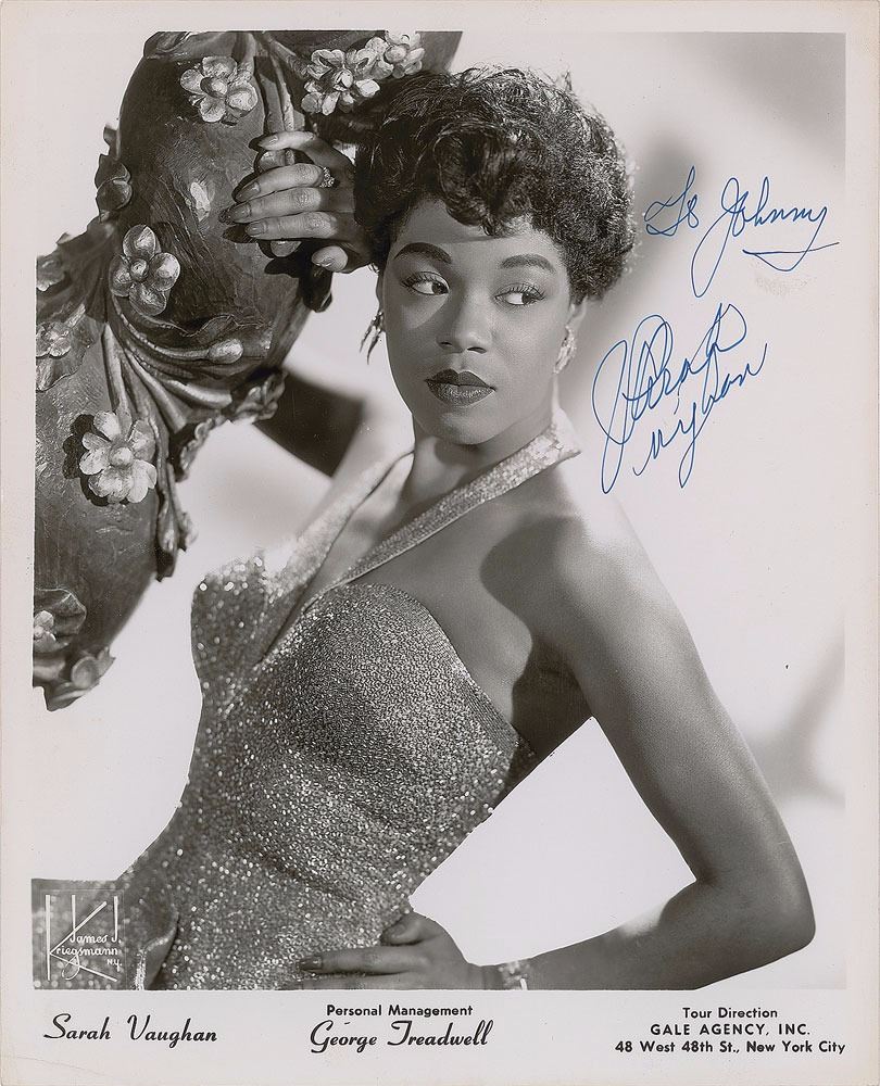 American jazz singer nicknamed 'Sassy' and 'The Divine One,' (1924–1990) who was a four-time Grammy Award winner, and the recipient of the NEA Jazz Masters Award in 1989. Vintage glossy 8 x 10 James J. Kreigsmann publicity photo of Vaughan in a striking half-length pose, signed and inscribed in fountain pen, "To Johnny, Sarah Vaughan.” In fine condition.