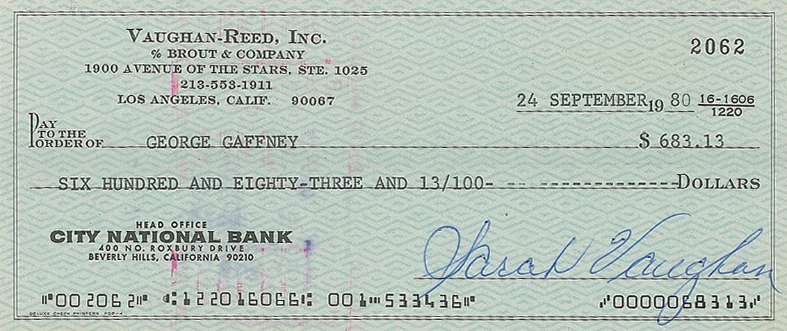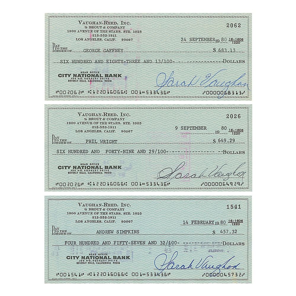 Group of three Vaughan-Reed, Inc. business checks, 7.25 x 3.25, filled out in type and signed by Sarah Vaughan, payable to her band members Andrew Simpkins, Phil Wright, and George Gaffney, dated from February 14–September 24, 1980; each is endorsed on the reverse by the associated band member. In fine condition.