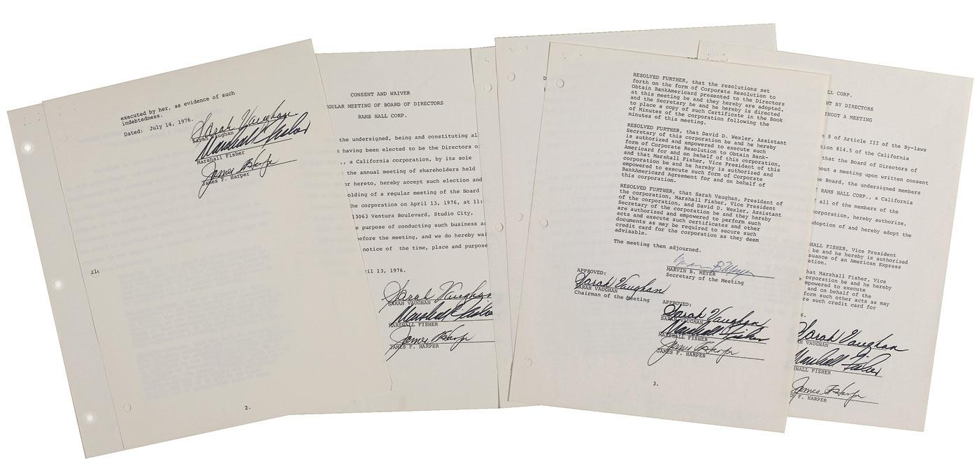 Four documents, seven total pages, 8.5 x 11, all dating to 1976 meetings of the Rams Hall Corporation and each signed at the conclusion in black felt tip by Sarah Vaughn. In overall fine condition, with a crease to one page, light handing wear and toning, and expected staple and filing holes.
