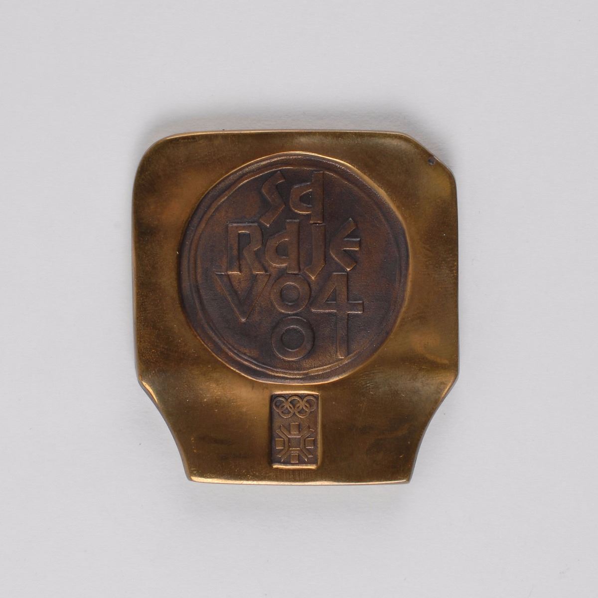 Participation medal issued for the Sarajevo 1984 Winter Olympics. Bronze, 60 mm x 65 mm, 129 gm, designed by Nebojsa Mitric. The front bears stylized raised text within a circle, “Sarajevo 84,” above the Olympic rings and logo; the reverse is plain with the monogram of the designer. Includes the original red box and leather presentation case. These smaller-sized participation medals were bestowed to athletes and officials, while the large or medium examples were presented to dignitaries and officials, all of which have become increasingly sought-after by collectors.