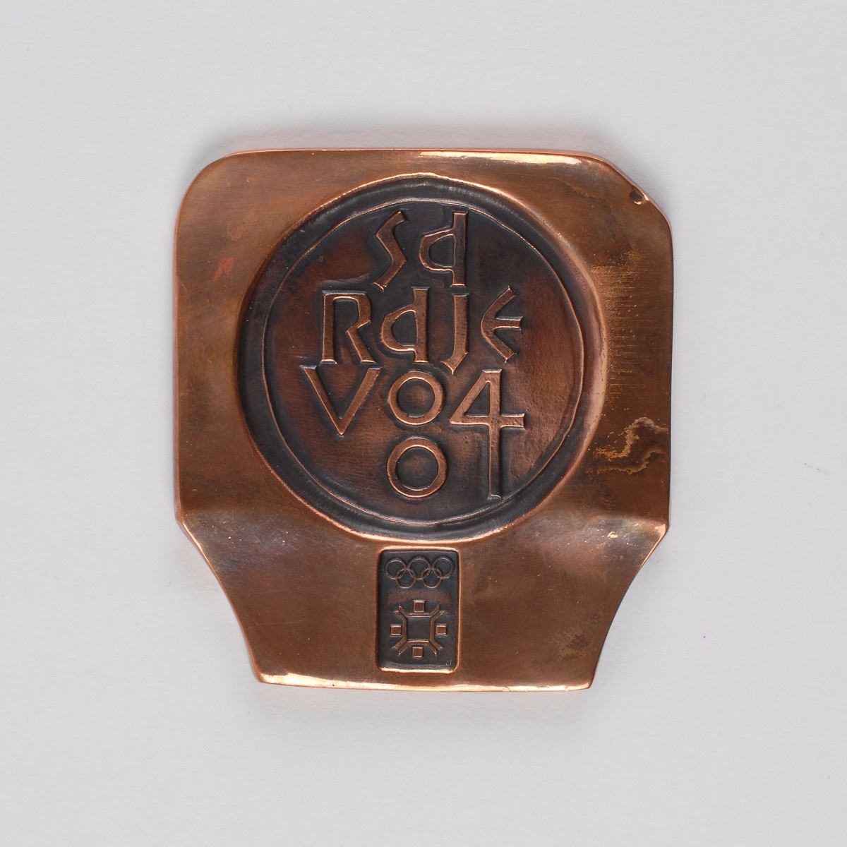 Uncommon participation medal issued for the Sarajevo 1984 Winter Olympics. Medium bronze, 78 mm x 86 mm, 219 gm, designed by Nebojsa Mitric. The front bears stylized raised text within a circle, “Sarajevo 84,” above the Olympic rings and logo; the reverse is plain with the monogram of the designer. These scarce participation medals were bestowed to dignitaries and officials.