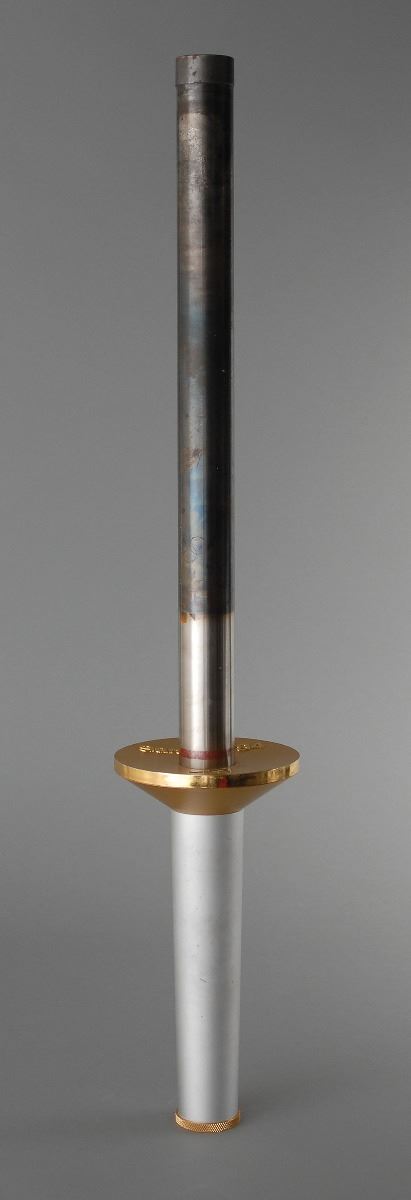 Official 1984 Sarajevo Olympics torch, comprised of lightweight metal with a long combustion tube, measuring 22.75? in length and 4? at its widest point, manufactured by the Mizuno Corporation of Japan. The handle is silver-colored and topped by a gold-tone base inscribed, “Sarajevo ’84,” with the Mizuno logo also raised in relief. The combustion tube bears the Olympic rings and emblem of the Sarajevo games, which has been darkened from having been used in the torch relay. For the Sarajevo relay, the route was split into two routes of east and west so that it would pass through the whole country and promote the Olympic ideal of coexistence. In all, it was carried by 1,600 torchbearers over a distance of 5,289 km. This was the first Winter Olympics held in a Communist state.