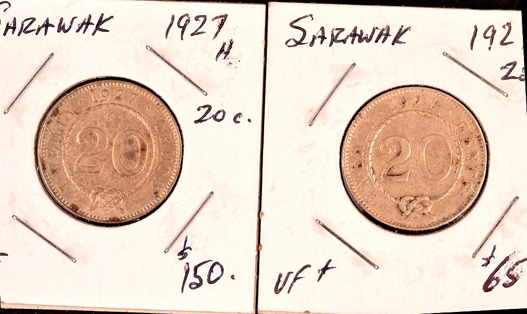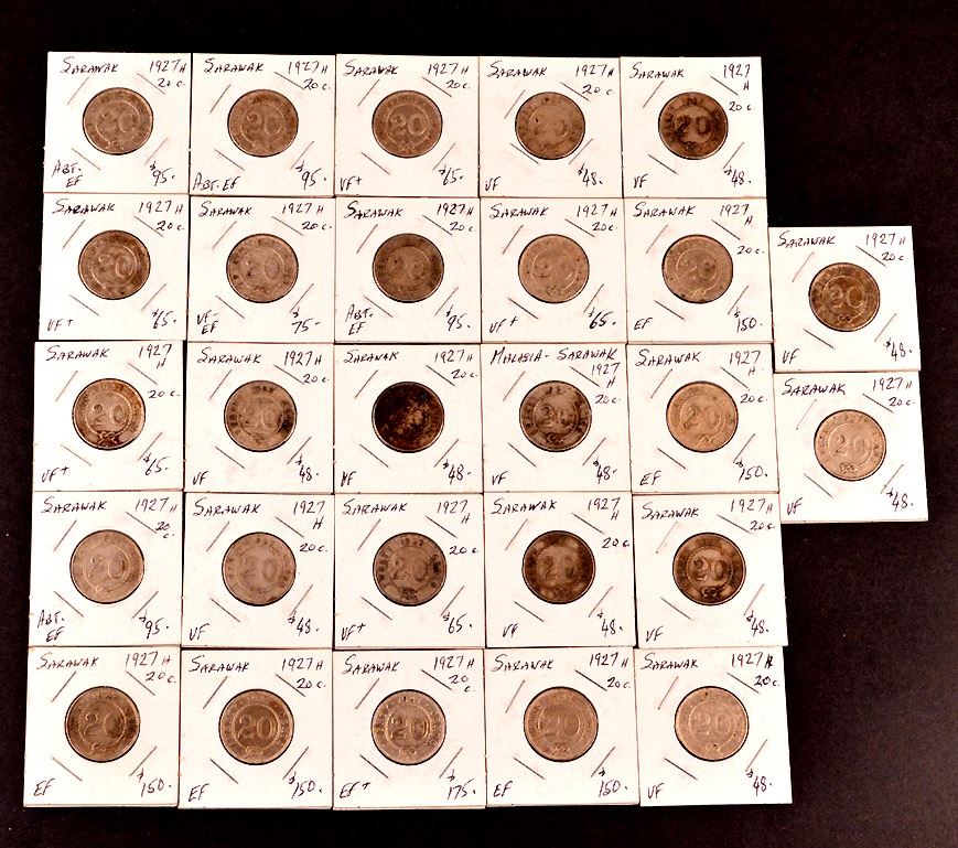 Sarawak 20¢ 1927h VF-XF. Lot of 27 coins, struck for C.V. Brooke, The English Raja of Sarawak. Condition range is VF-EF.
