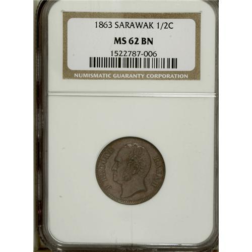 <B>British colonial, bronze 1/2 Cent 1863,</B></I> KM-2, Rajah J. Brooke, MS62 BN NGC.<BR><BR><b>Shipping:</b> Coins & Currency (<a target="_blank" href="http://www.heritageauctions.com/common/shipping.php">view shipping information</a>)