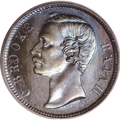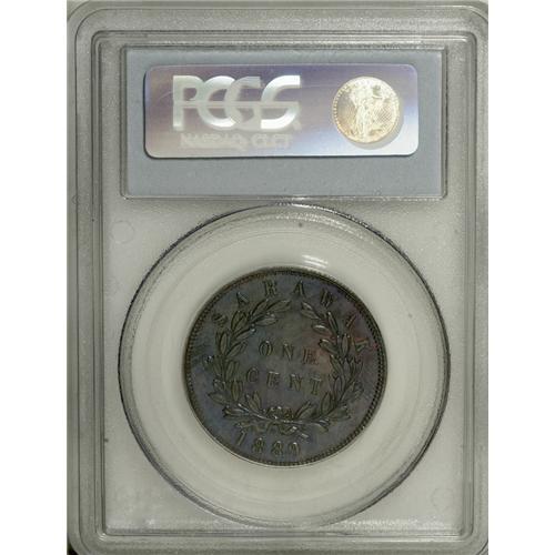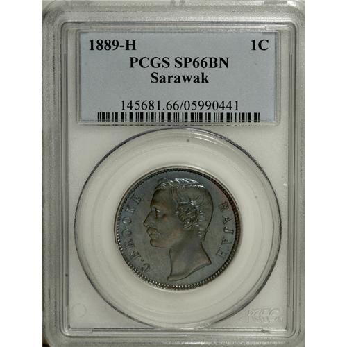 <B>British colonial bronze 1 Cent 1889-H,</B></I>Rajah C(harles) Brooke, KM-6, SP66 BN PCGS, a superb Proof of Record with vivid blue iridescent toning which, since it was made at Heaton instead of the Royal Mint, has been designated a Specimen. A few tiny strike-throughs through the rajah's name. A magnificent piece.<BR><BR><b>Shipping:</b> Coins & Currency (<a target="_blank" href="http://www.heritageauctions.com/common/shipping.php">view shipping information</a>)