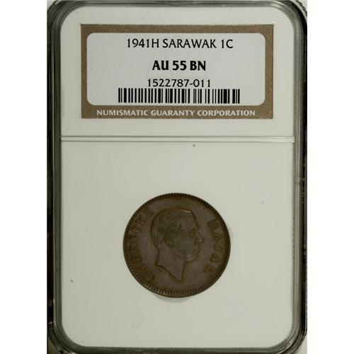 <B>British colonial bronze 1 Cent 1941-H,</B></I>Rajah C. V. Brooke, KM-18, AU55 BN NGC, perfectly graded with hints of mint red. And the dynasty continued, but not beyond this year, its last. Evidently almost all of the 3 million struck perished in the melting pots. Krause estimates that only 50 pieces exist. Pretty as well as very rare!<BR><BR><b>Shipping:</b> Coins & Currency (<a target="_blank" href="http://www.heritageauctions.com/common/shipping.php">view shipping information</a>)