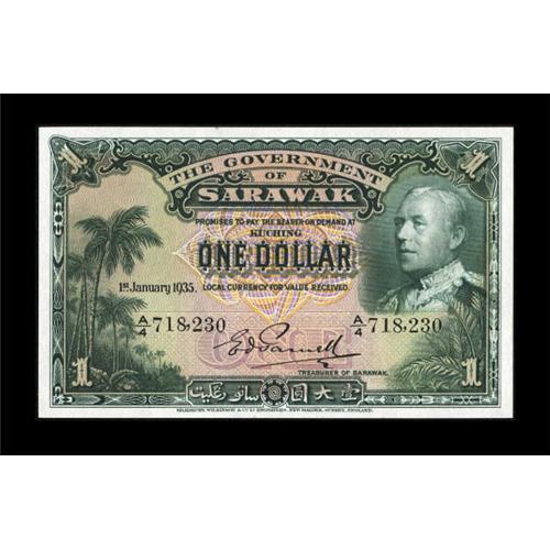 <B>Sarawak</B></I> Government of Sarawak $1 January 1, 1935 Pick 20<BR> The colors are bright on this example rarely found in this state of preservation. <B>Choice Crisp Uncirculated</B></I>. <BR><BR><b>Shipping:</b> Coins & Currency (<a target="_blank" href="http://www.heritageauctions.com/common/shipping.php">view shipping information</a>)