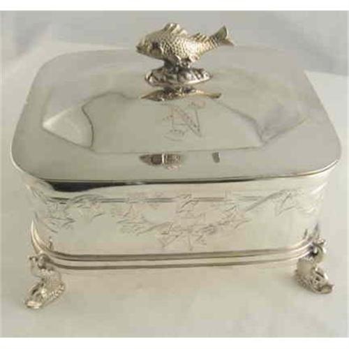 This beautiful Fish box is in amazing condition/ Four fish feet and a fish finial. Made originally to hold a Victorian sized can of sardines. It is monogrammed with the letter "N" and the sides are engraved with trails of ivy. There are normal polishing marks. No deep scratches.