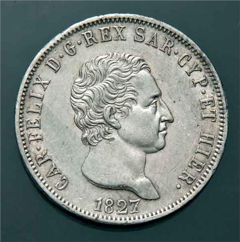 Sardinia - V.E. I - 5 L. 1827 - Ag - 5 Lire 1827 Zecca: Torino - Diritto: effigie del Re a destra - Rovescio: stemma completo di Casa Savoia coronato e ornato dal Collare dell'Annunziata fra due rami di quercia -