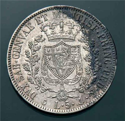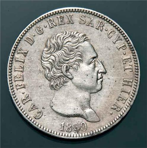 Sardinia - V.E. I - 5 L. 1830 - Ag - 5 Lire 1830 Zecca: Genova - Diritto: effigie del Re a sinistra - Rovescio: semma completo di Casa Savoia coronato e ornato dal Collare dell'Annunziata fra due rami di quercia -