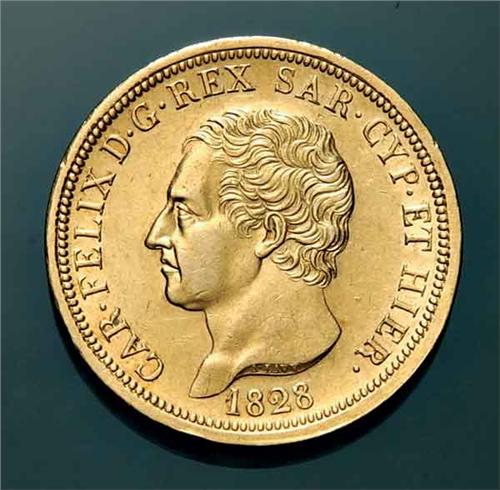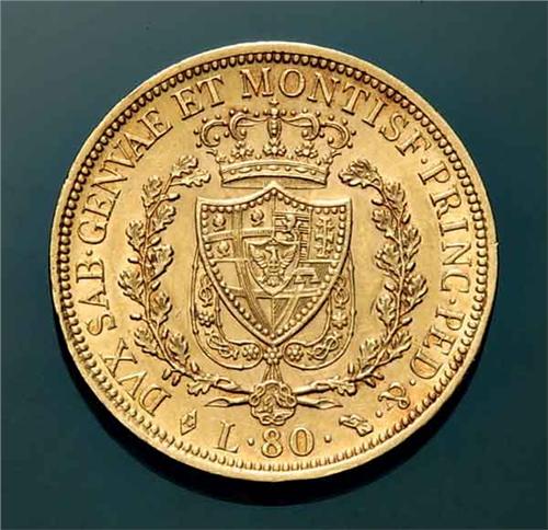 Sardinia - V.E. I - 80 L. 1828 - Au - 80 Lire 1828 Zecca: Torino - Diritto: effigie del Re a sinistra - Rovescio: stemma completo di Casa Savoia coronato e ornato dal Collare dell'Annunziata fra due rami di quercia - Di qualità molto buona