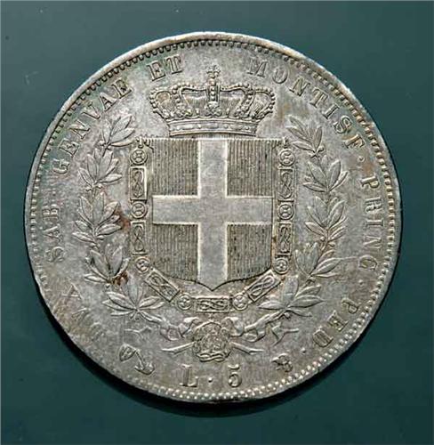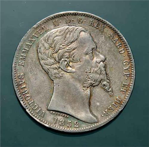 Sardinia - V.E. II - 5 L. 1852 - Ag - 5 Lire 1852 Zecca: Genova - Diritto: effigie del Re a destra - Rovescio: stemma di Casa Savoia coronato e circondato dal Collare dell'Annunziata - Patina di antica collezione