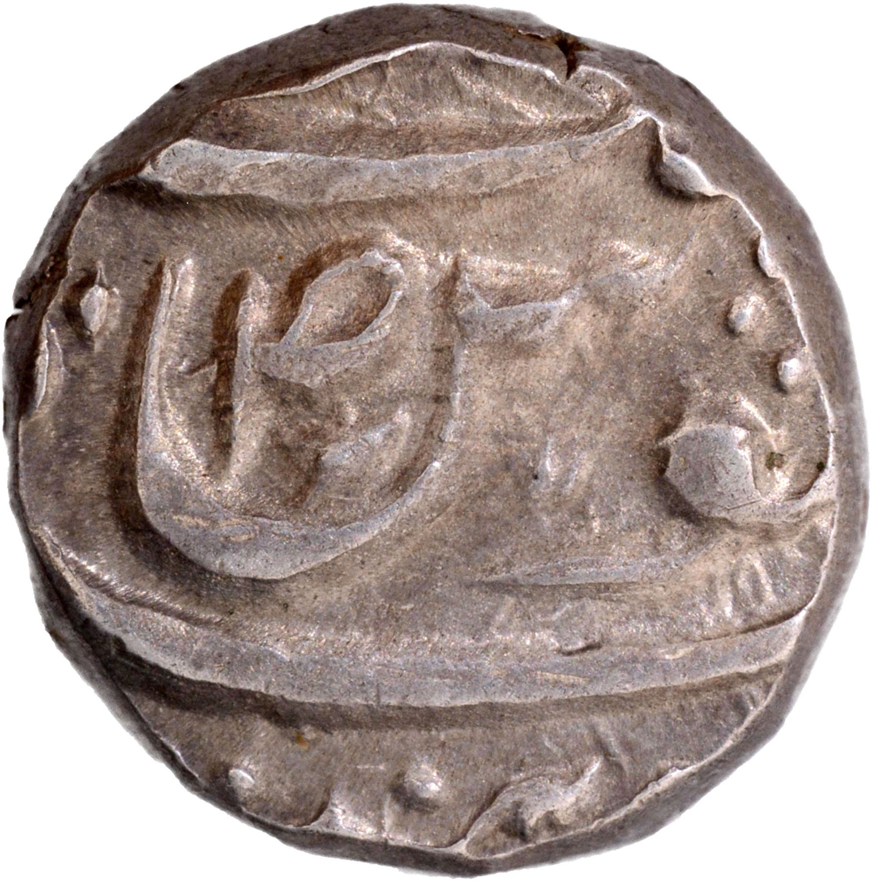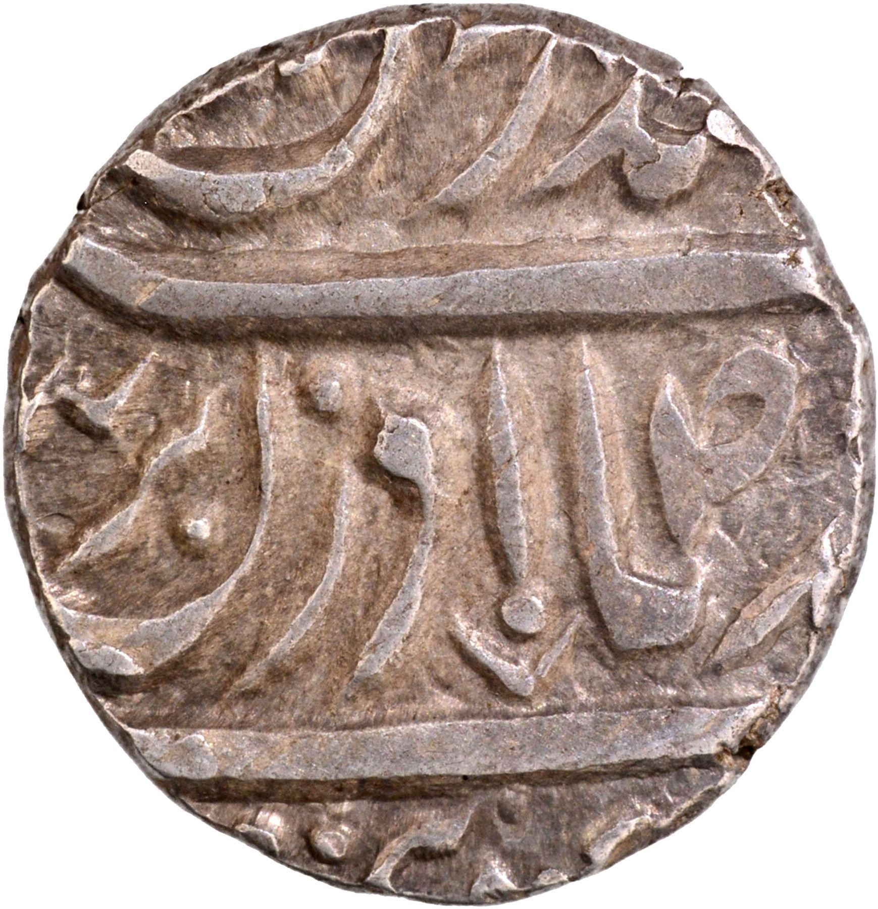 CIS-Jind, Sangat Singh (1822-1834 AD), SarhindMint,Silver Rupee,Qadir-eBechunCouplet,In the name ofAhmad Shah Durrani, Obv: Persian legend Sikka zad bar seem-o zar az auj mahi ta bamah, hukm shud az Qadir-e Bechun ba Ahmad Badshah, Rev:Persian legend Swad in Sen of juluszarbSarhind at the bottom,10.85g, 18.64mm, (Unlisted in KM),no test mark, choice extremely fine, Rare.