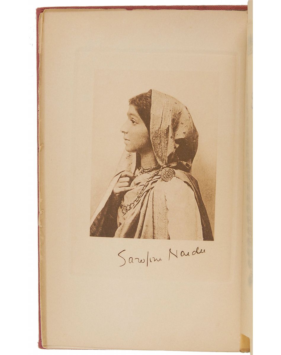 Indian activist and poet (1879–1949) who was the first woman to become the governor of an Indian state, and the second woman to become the president of the Indian National Congress in 1925. Signed book, The Sceptred Flute: Songs of India. Later printing. NY: Dodd, Mead and Company, 1928. Hardcover, 5.5 x 8.25, 231 pages. Signed in black ink under her image on the frontispiece, and additionally signed and inscribed on the half-title page, “Sophie Hart from her friend, Sarojini Naidu, Tower Court, Wellesley, 25th Feby 1929, ‘Life is a prism of my light and Death the Shadow of my face.’” Autographic condition: frontispiece rates fine, with some scattered light edge wear and toning; half-title page rates very good to fine, with old tape along hinge and edges, rusty paperclip mark along top edge, and some scattered toning and edge chips. Book condition: G+/None. A rare autograph from the pioneering writer and politician who campaigned for Indian independence, enhanced by a powerful quote from one of her poems.