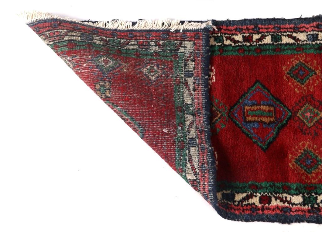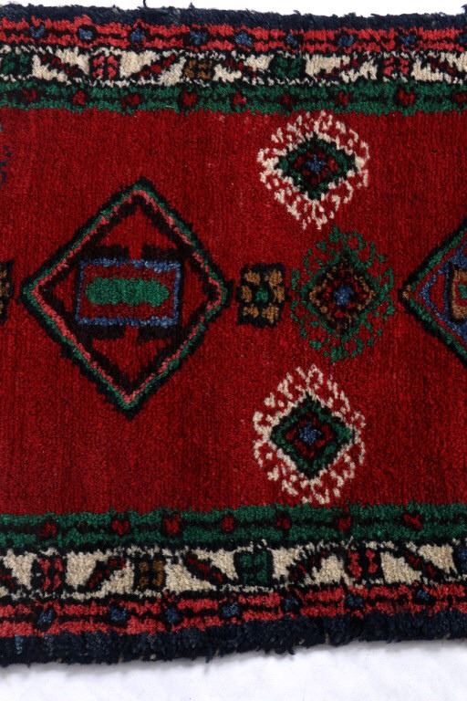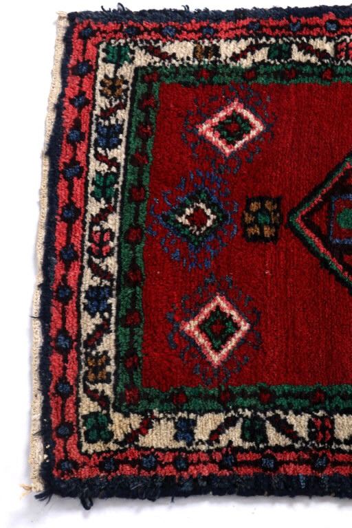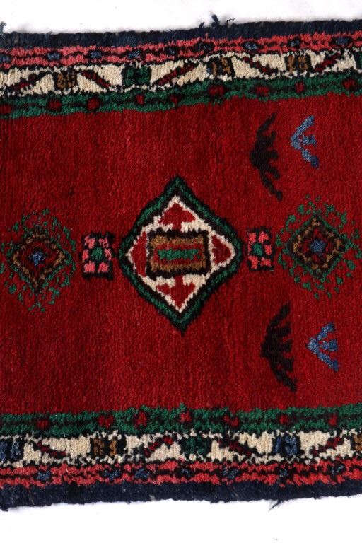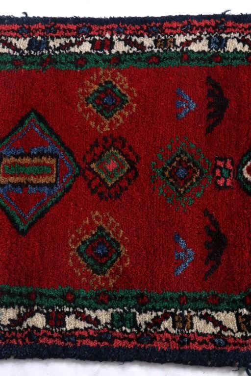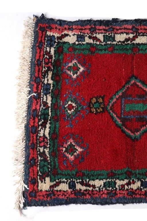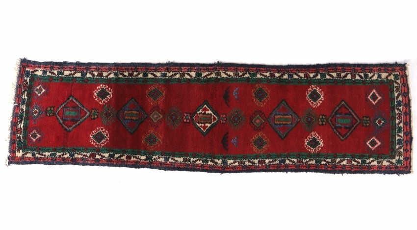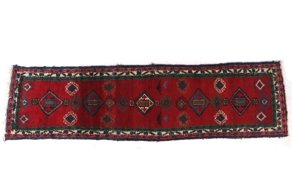 Included in this lot we have a Sarouk Persian hand knotted wool runner rug originating from the 1930's. The rug featured geometric floral patterns, bright colors, and a tight weave. The Sarouk rug is a style of Persian rug made in the village of Sarouk located 25 miles North Arak. The Sarouk rugs are known for their floral patterns and tight weave. The rug displays geometric medallion patterns with a multi layered border. The pieces shows colors of red, green, white, black, blue, and gold. The piece shows a wonderful tight weave and fringe at one end. The rug shows good condition, with little wear and use. The piece measures 28" wide and 100 1/2" long.