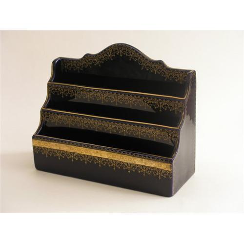 Beautiful Sarreguemines cobalt blue and gold letter rack. It is marked on the underside with an impressed Sarreguemines in block, un-serifed letters, a mark used between 1889 and 1922 approximately. The Sarreguemines manufacture was at one time referred to as the French Wedgwood for its fine quality and classic decoration. In very good condition with minor imperfections as shown.