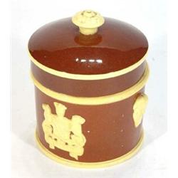 Sarreguemines stoneware pot and cover with armorial crest and masks to side, impressed marks to base, 12cm high