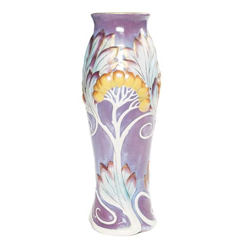 Exceptional Sarreguemines vase, large form with a finely executed Art Nouveau design of stylized trees and leaves in ivory, purple, brown and gold against a purple and blue ground, signed, 15.5"h, wonderful shape, great example