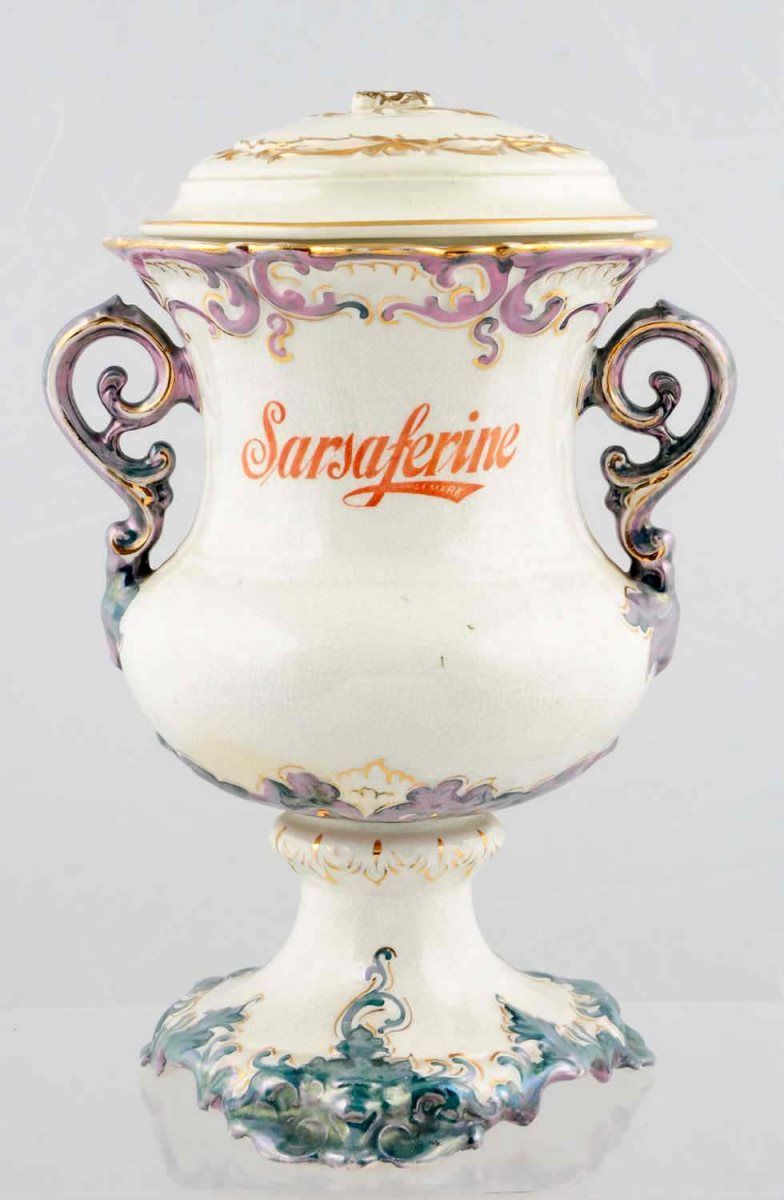Complete with a reproduction lid with missing/ground top handle. You will likely never find another like this, as it is the first Gary has seen or heard of. Name appears on both sides and the piece exhibits only light soiling and typical small pattern cra