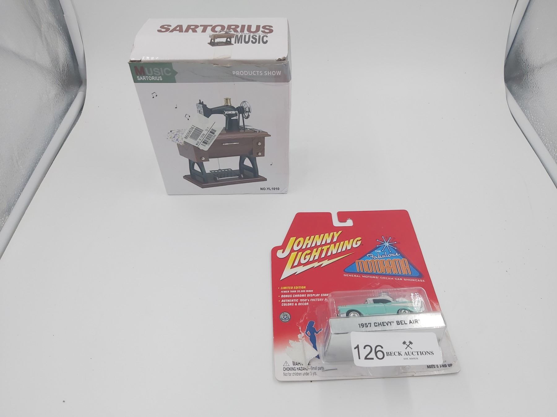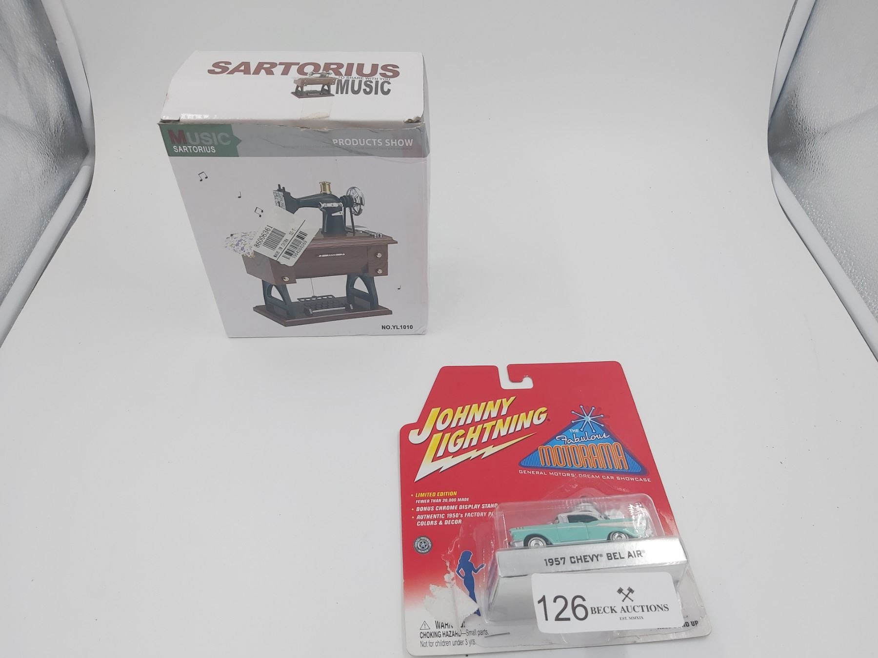 Sartorious Sewing Machine Music Box and Johnny Lightning 1957 Chevy Belair